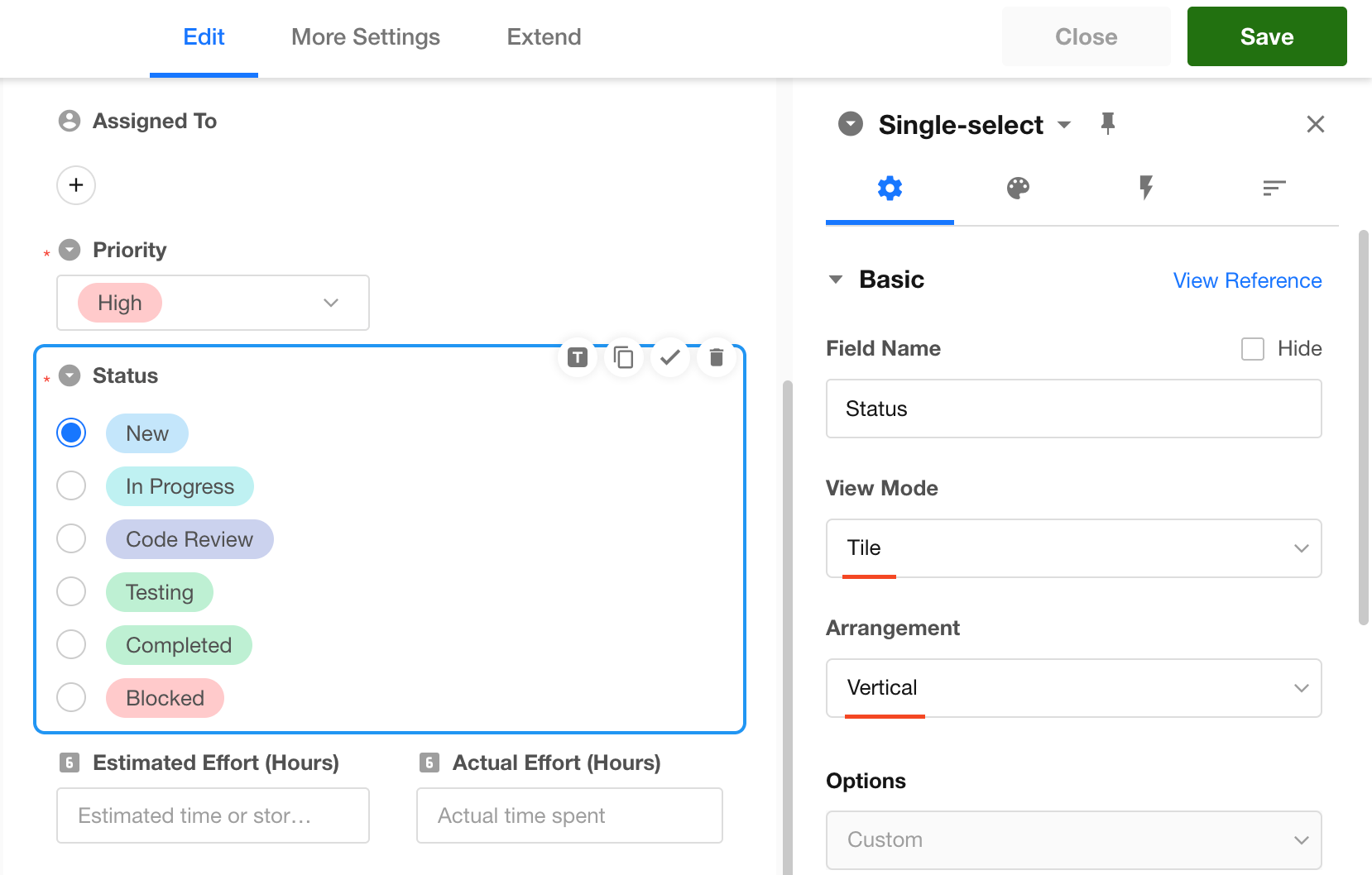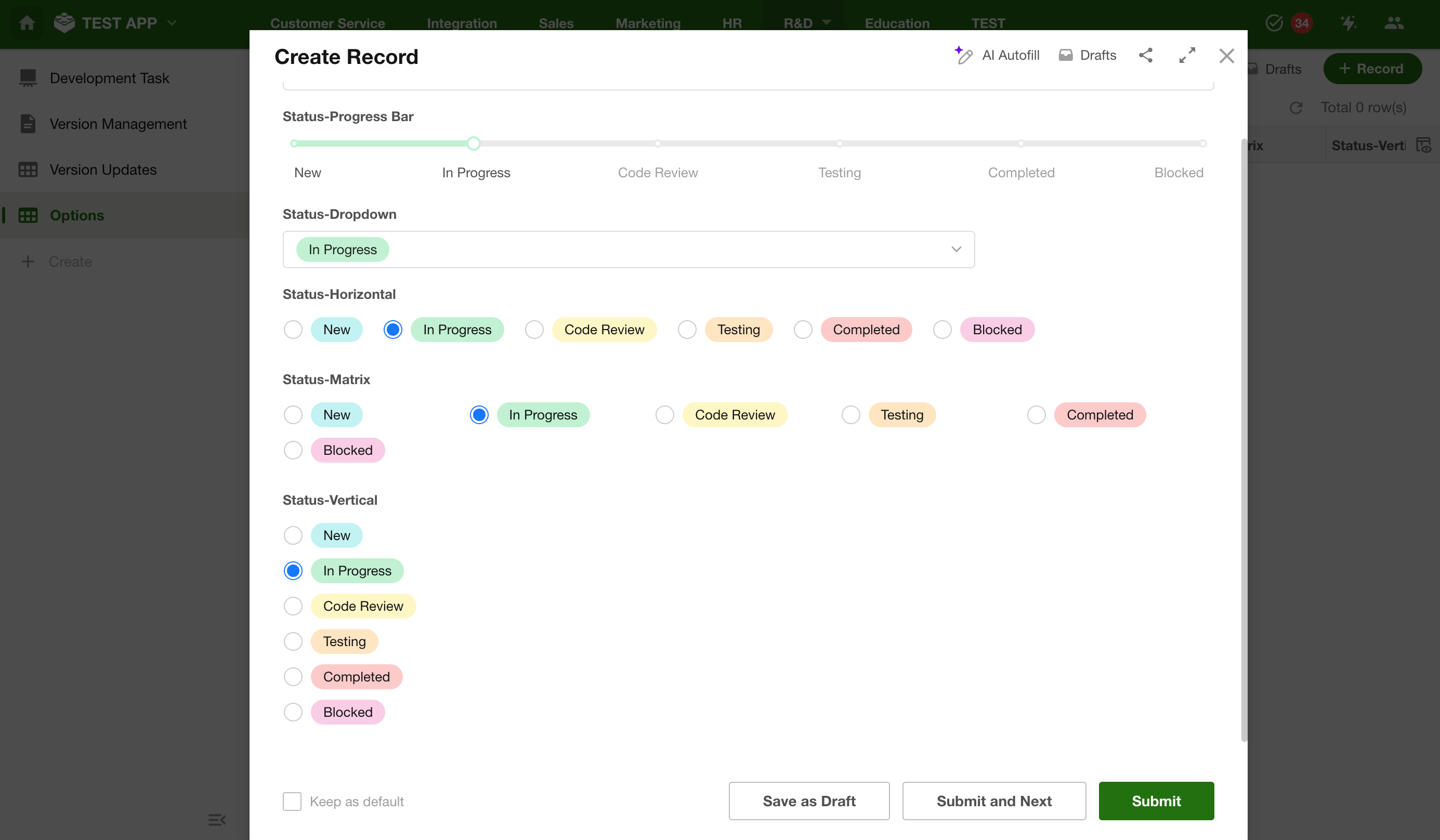 Options can be displayed in three ways: Dropdown, Tiled Layout (horizontal, vertical, or matrix), and Progress Bar. These can be combined with the field’s width settings for better layout and visual presentation.