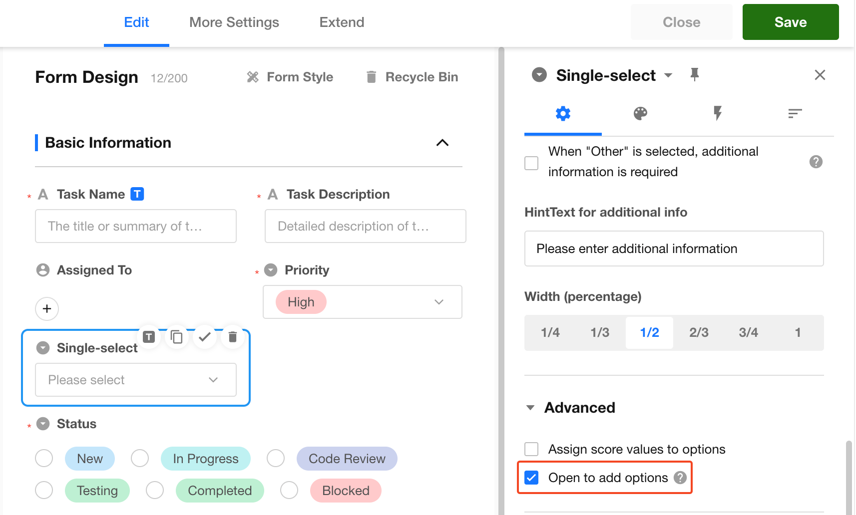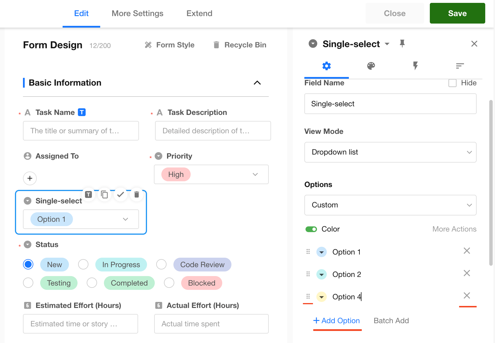 Single select and multi select fields allow users to complete input by selecting predefined options, improving data entry efficiency. Each option can also be assigned a value for use in business calculations.