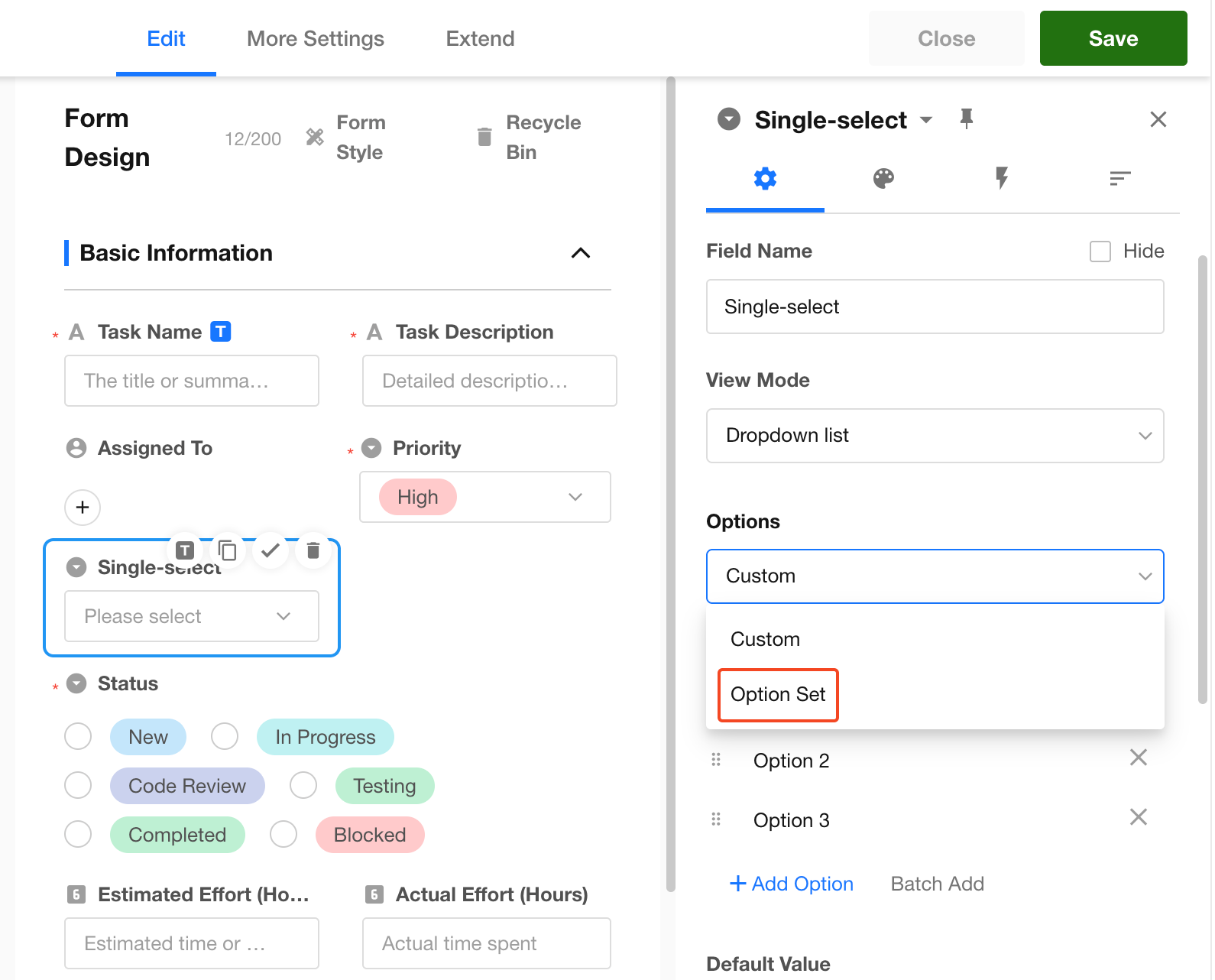 An option set is a shared option template (or data source). Single select and multi select fields can directly use an existing option set, or convert custom options into an option set for reuse across worksheets.