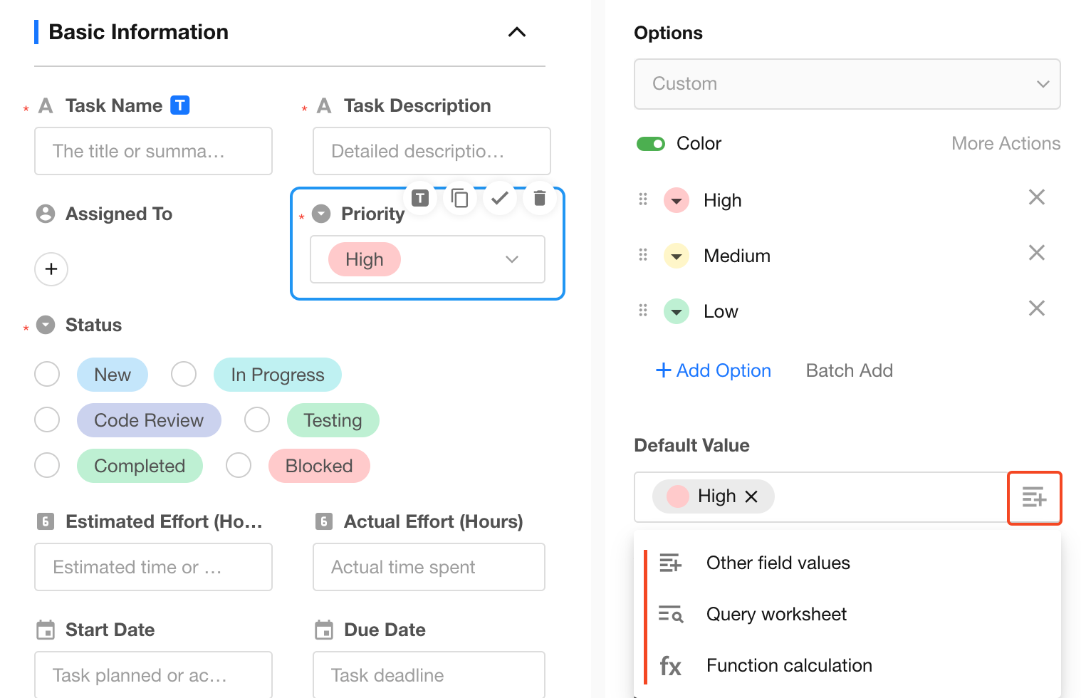 Custom options can be converted into an option set. After conversion, any edits will automatically sync to the option set. Fields in other worksheets referencing this option set will also update automatically.