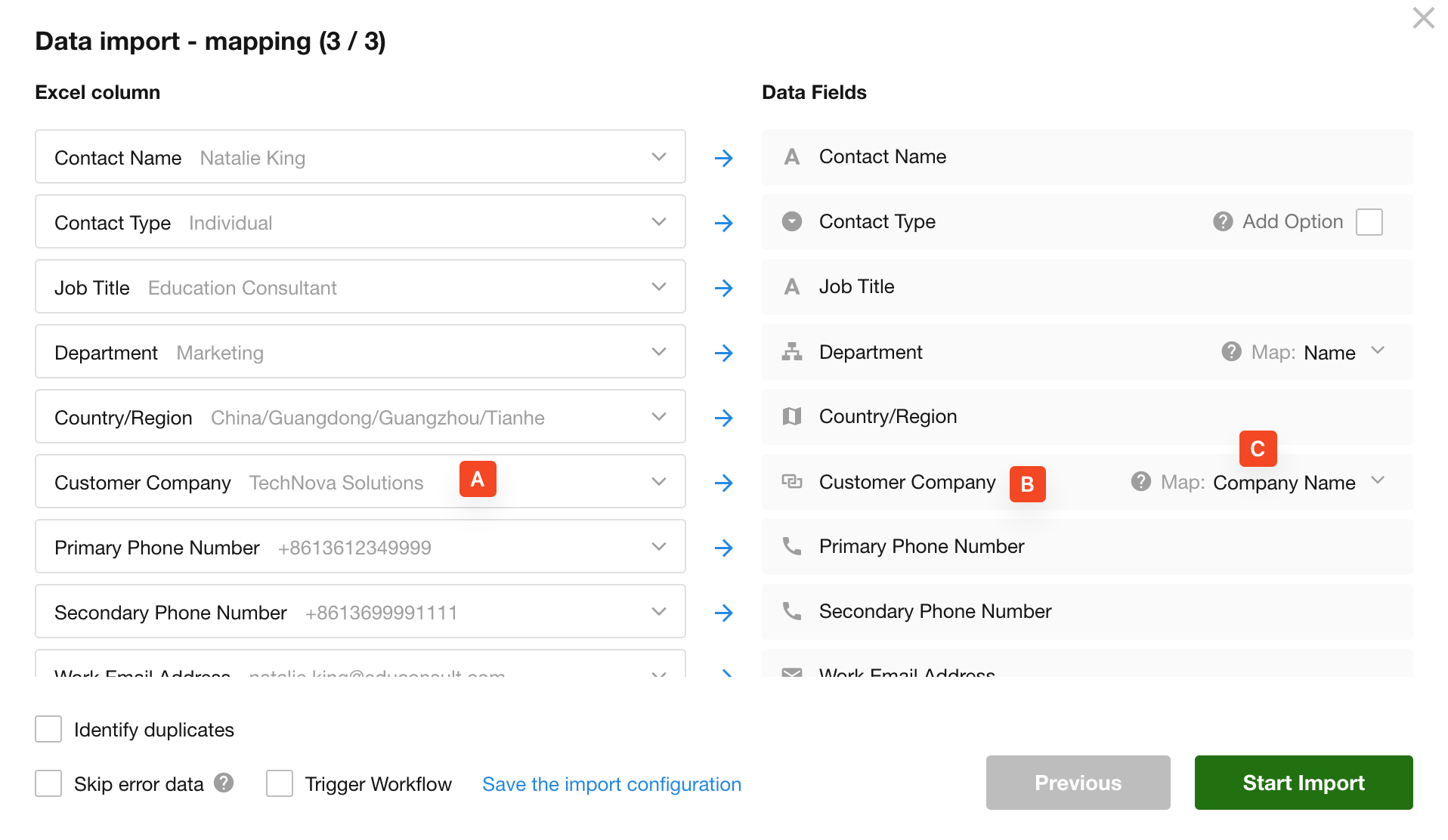 If the company information already exists in the Company worksheet, you can automatically link it when importing contacts.