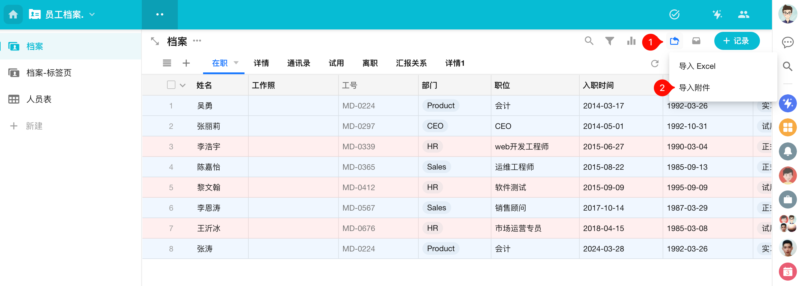 在工作表顶部工具栏,点击【导入】图标,选择【导入附件】。