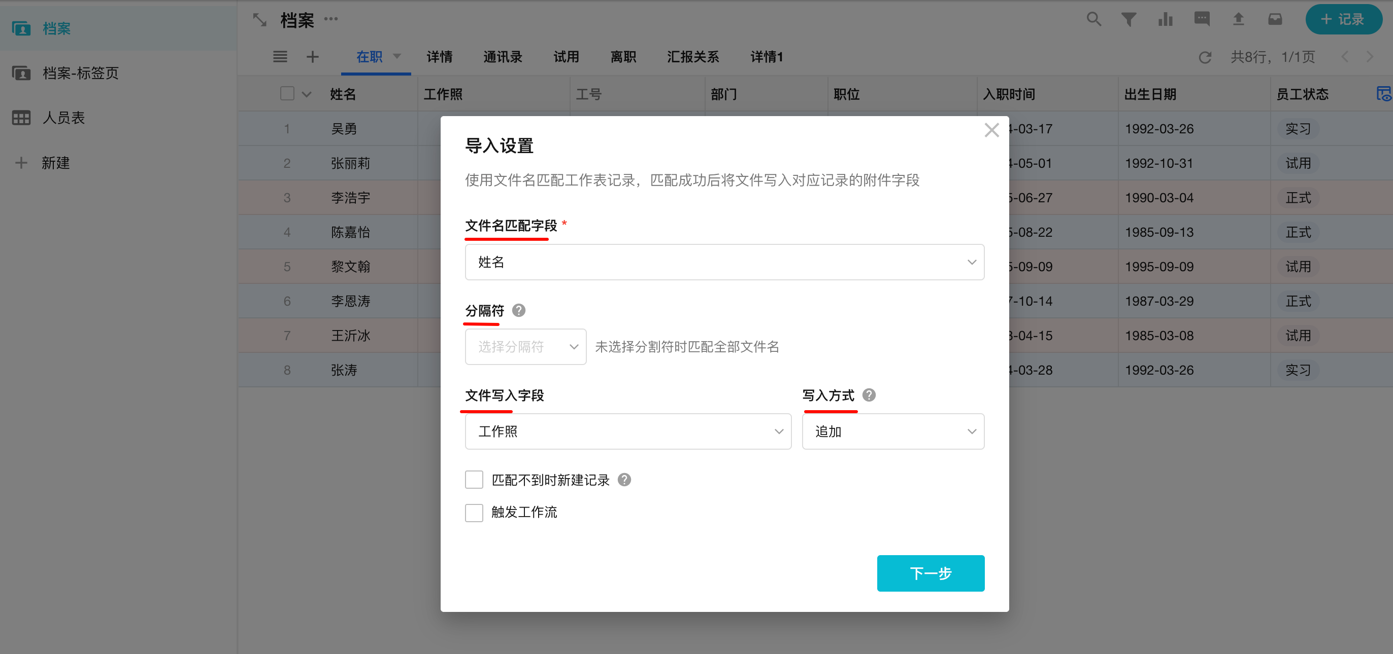 文件名匹配字段: 指定一个用于识别身份的字段(如“工号”或“合同编号”)。系统将提取文件名与该字段值进行匹配。