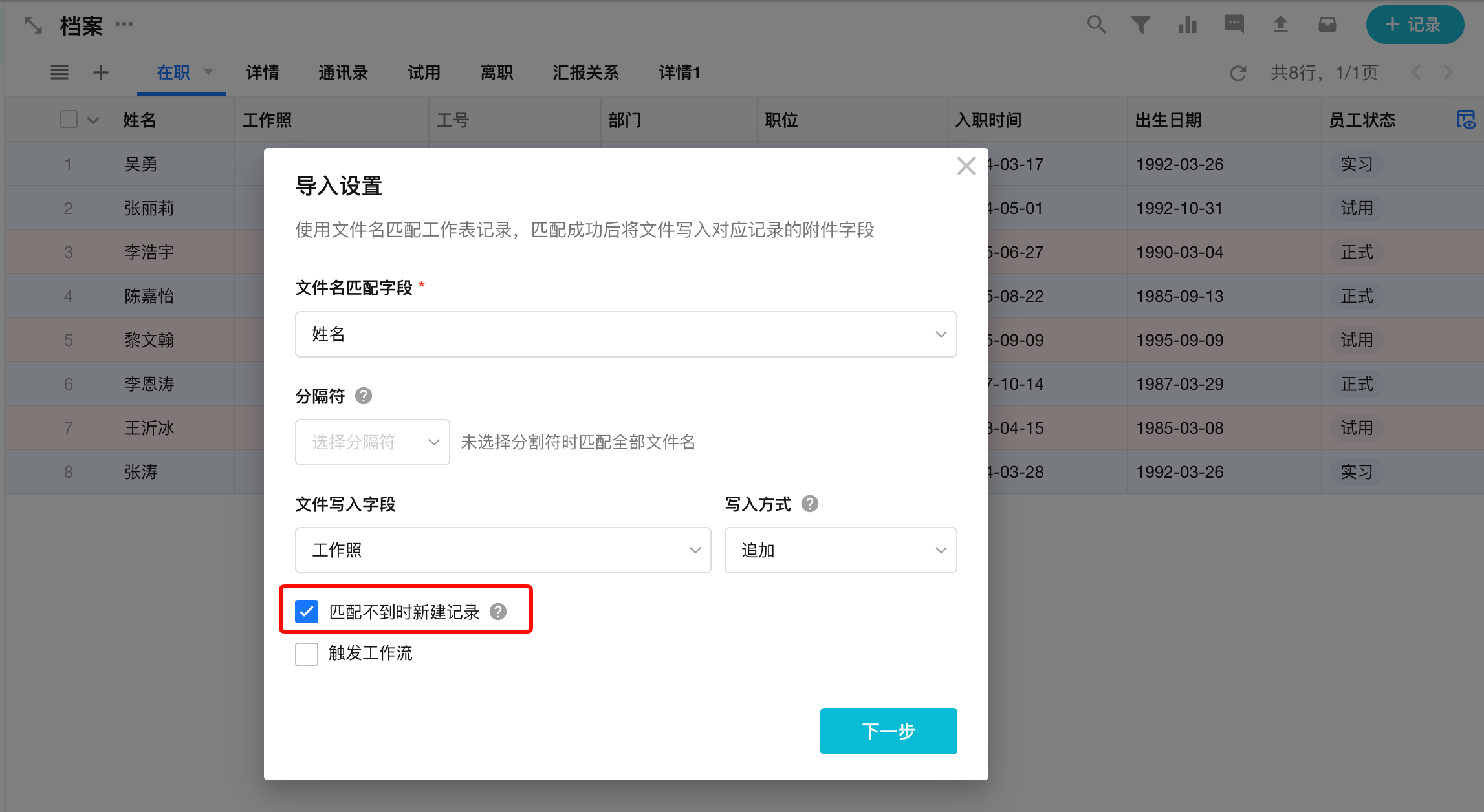 若开启“匹配不到时新建记录”,未匹配到现有记录的附件将自动创建为新记录: