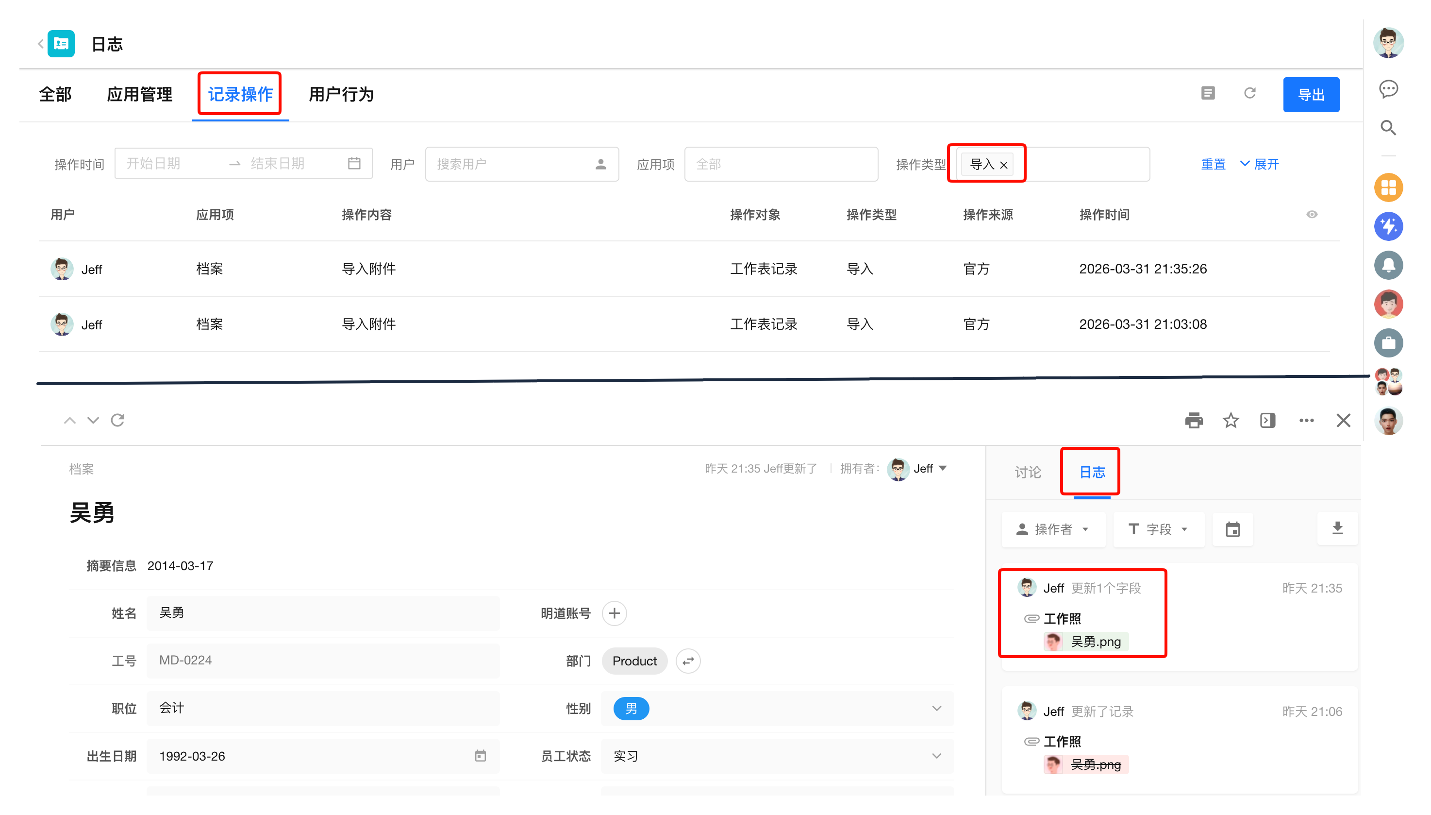 应用日志:在“记录操作”类目下,操作类型为“导入”,对象为“工作表 记录”。