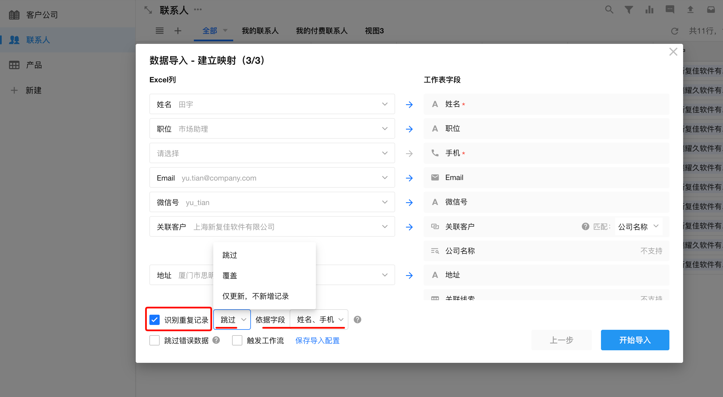 导入时可以自动建立和其他表记录的关联关系。例如,导入联系人时,有个公司的字段,如果公司已经在《客户公司表》中存在,那么可以自动关联到对应的公司记录。