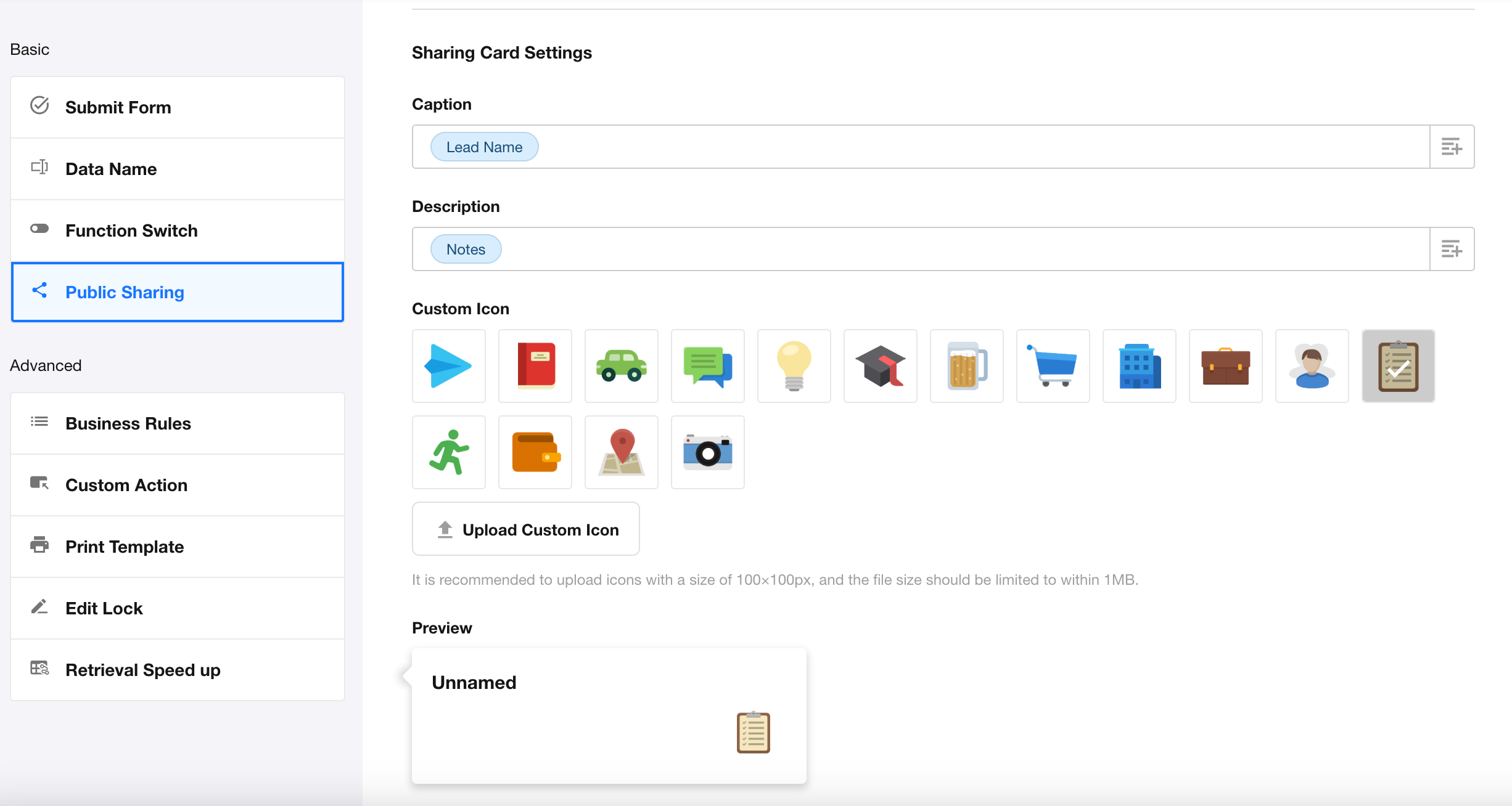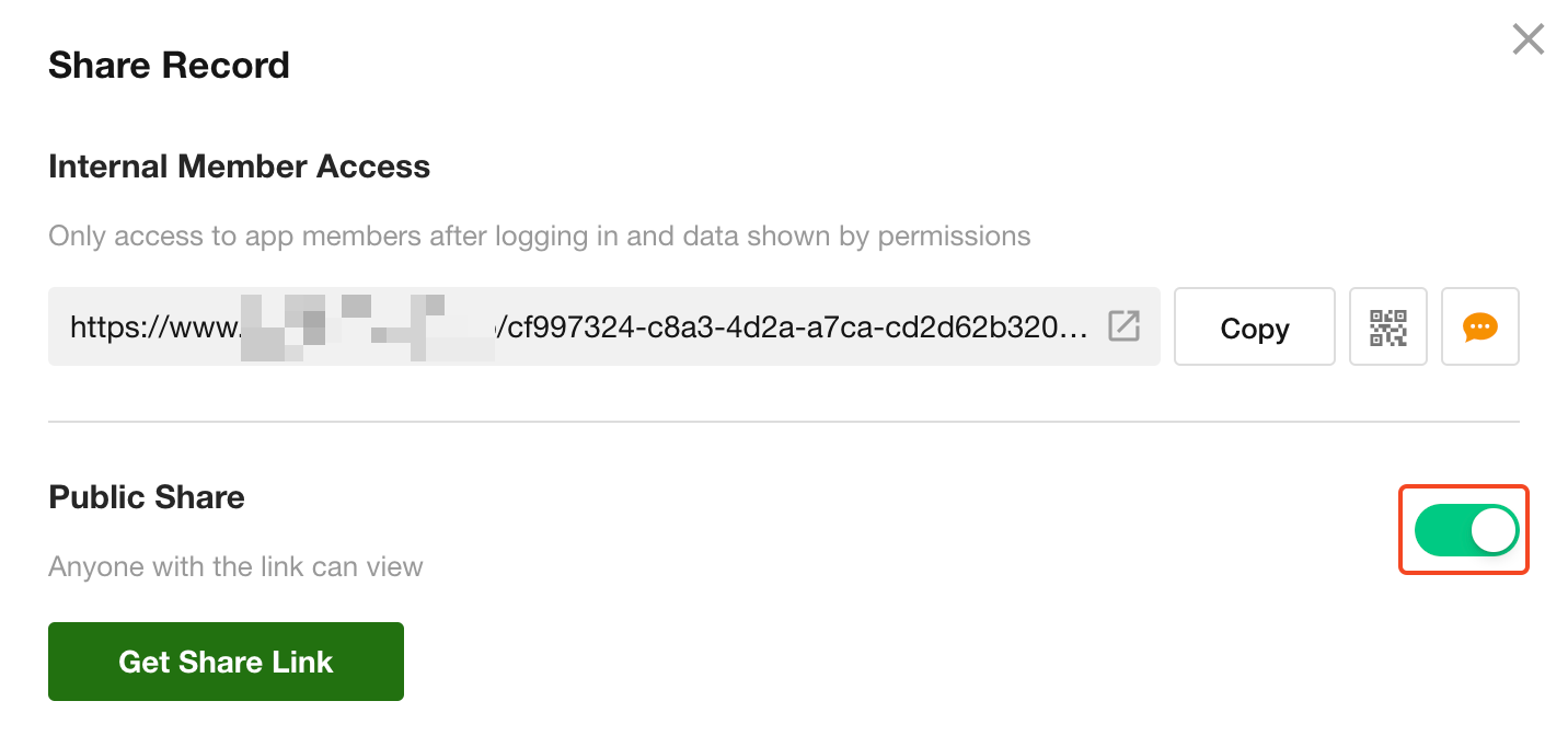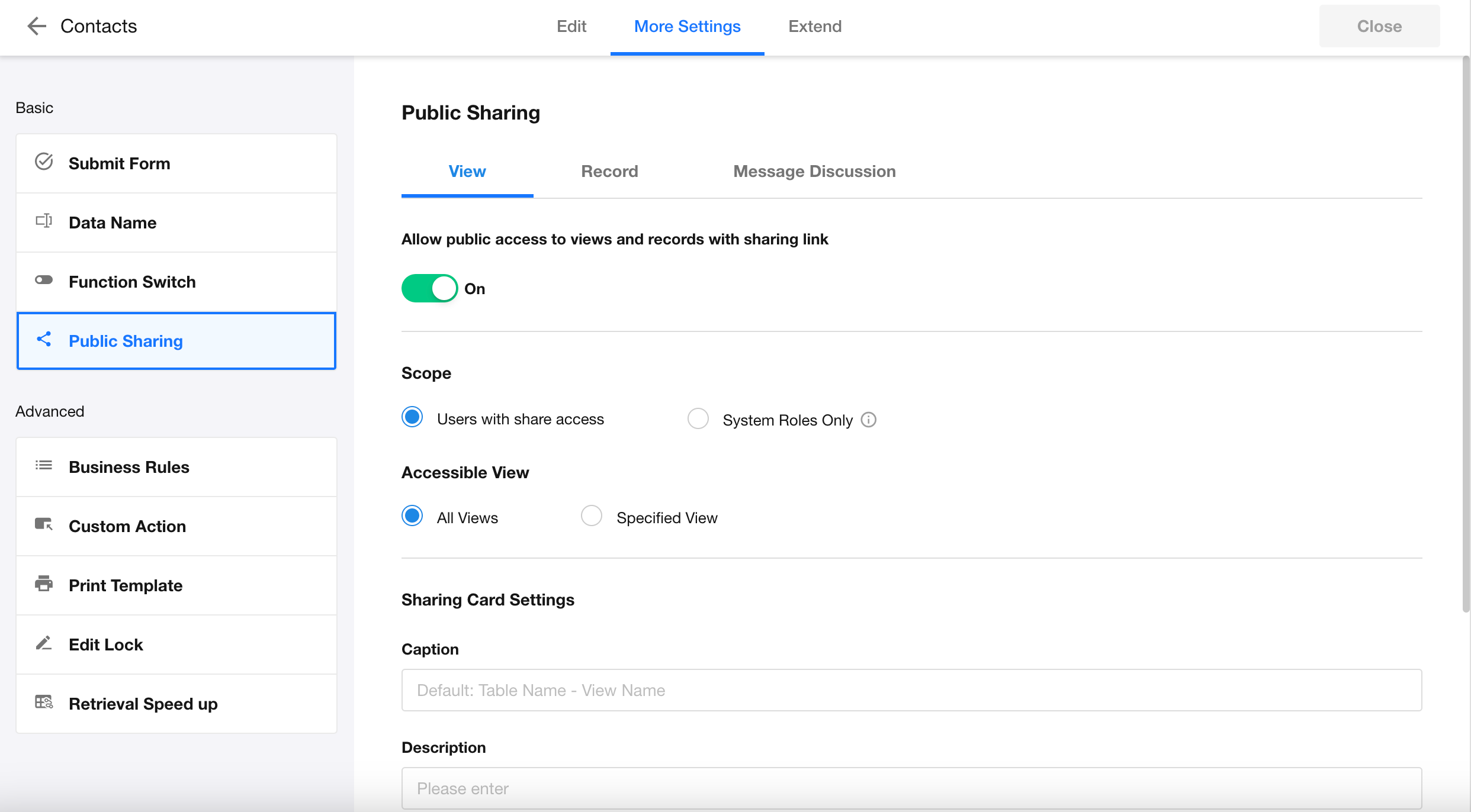 Navigate to [Edit Form] > [More Settings] > [Public Sharing], and switch to the "Record" tab to enable or disable the record sharing feature.