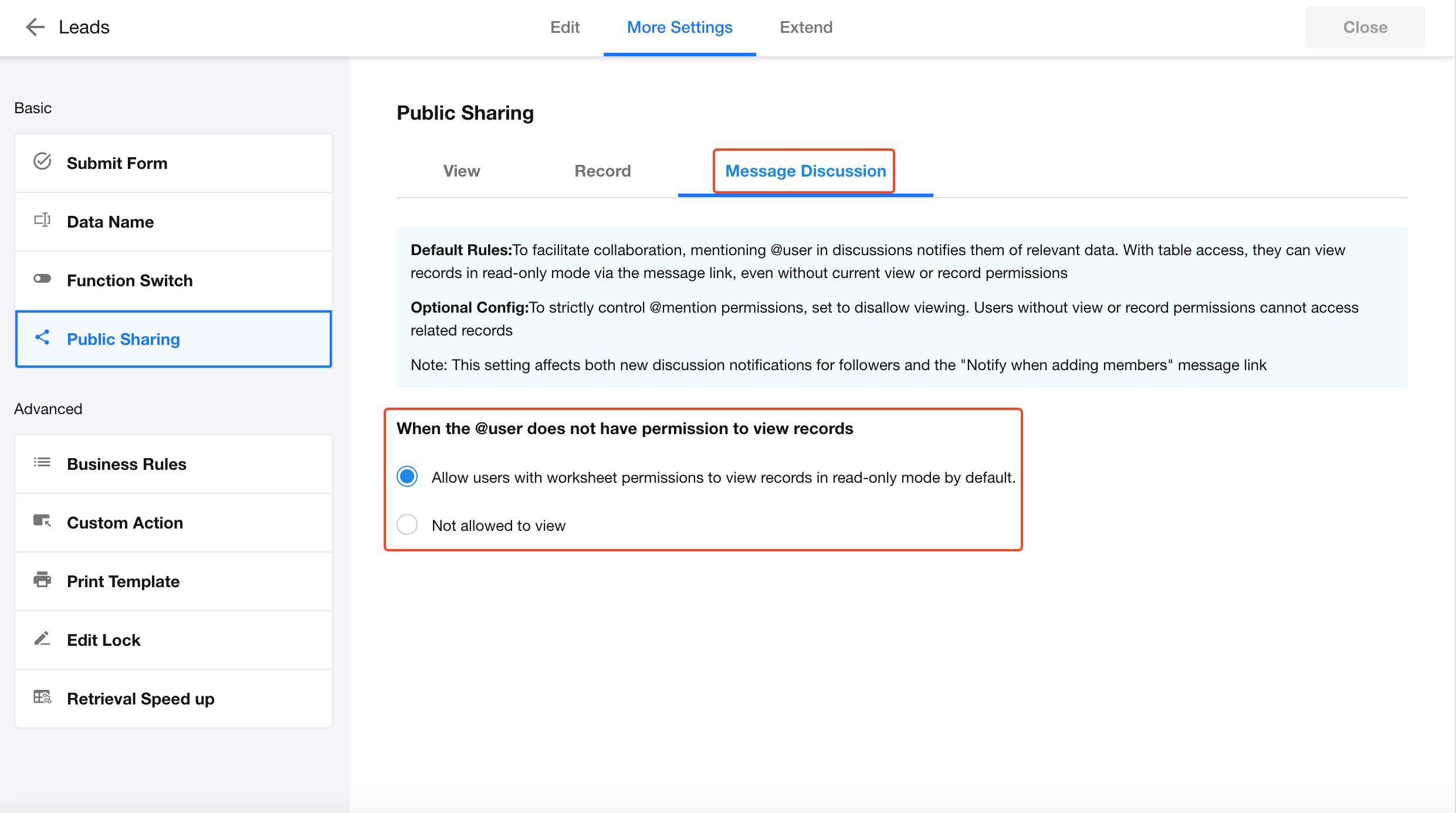When mentioning others using @ in a record, you can configure whether non-members are allowed to view the record details for data security.