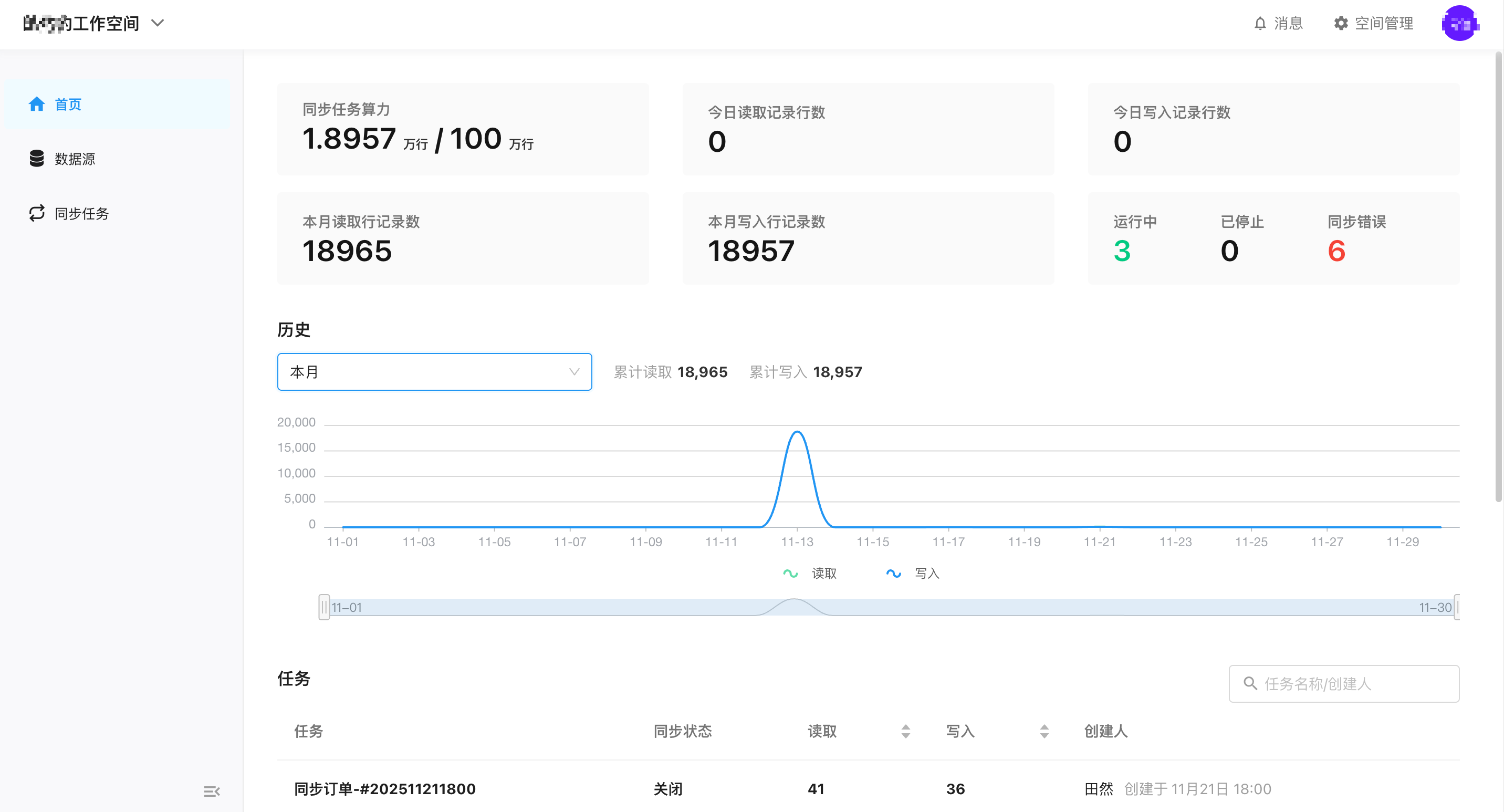首页为用户提供数据同步平台的整体运行概览,包括算力使用、今日与本月数据同步情况、任务运行状态统计、历史运行趋势图,以及任务运行列表,用于辅助定位运行异常的任务。