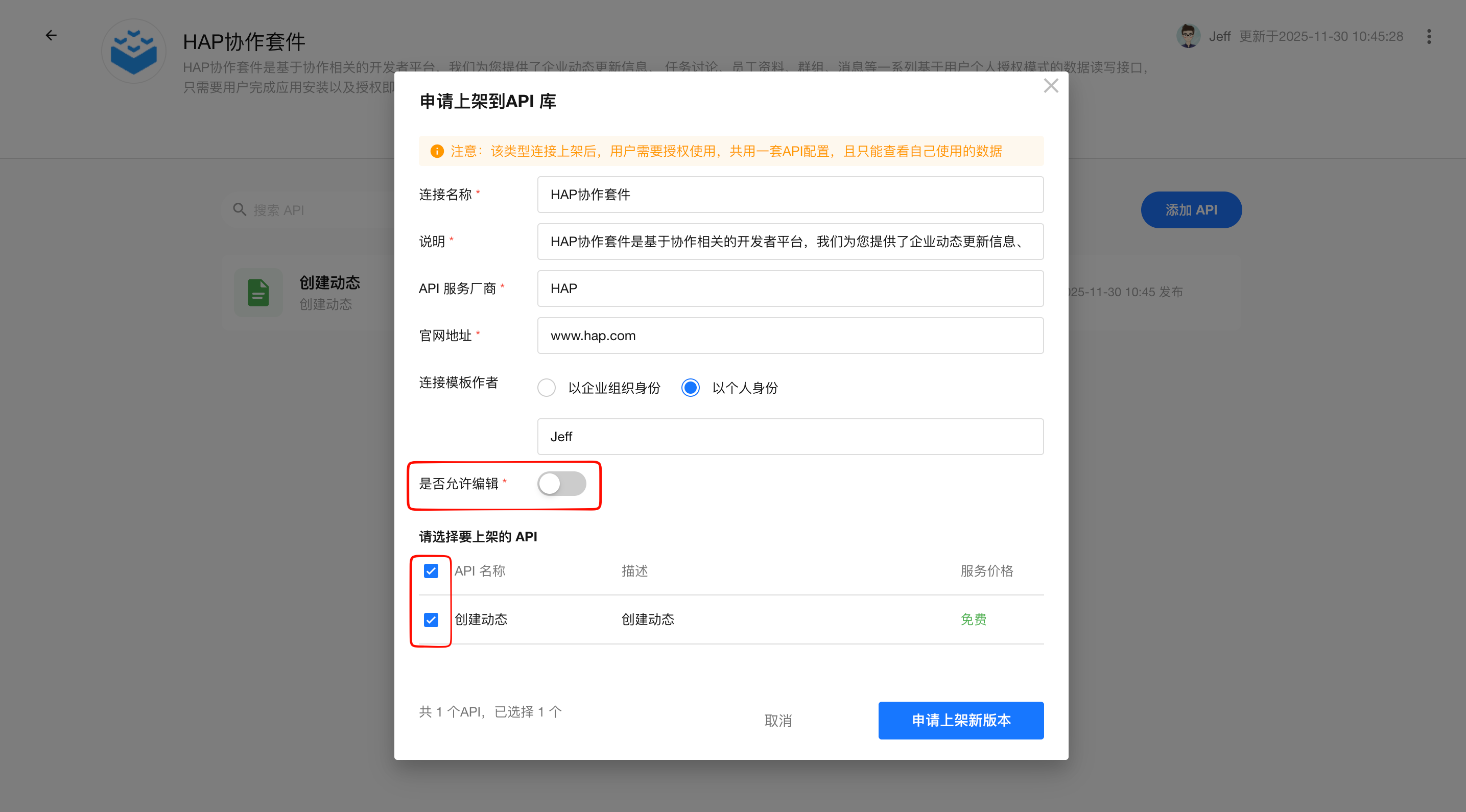 在用户使用集成中心API库的接口过程中,作者需要对所拥有的API更新上架。需要将更新的接口进行复制并且关闭原有接口重新申请上架,否则需要维护更新的API则不会出现在已安装的用户连接中。