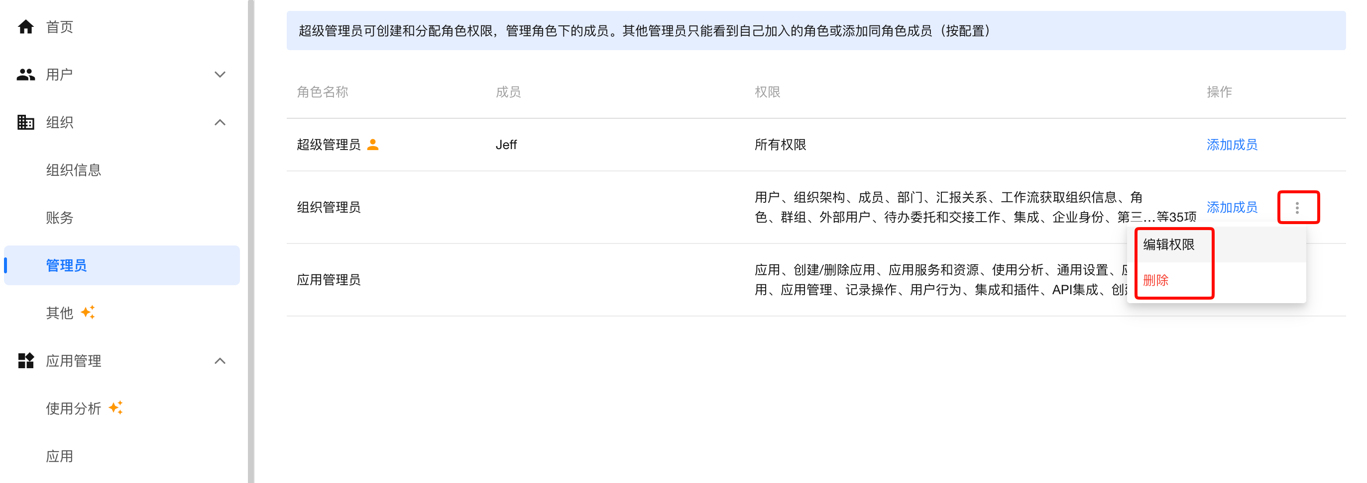 点击角色右侧的操作按钮,可进行“编辑权限”或“删除”操作。