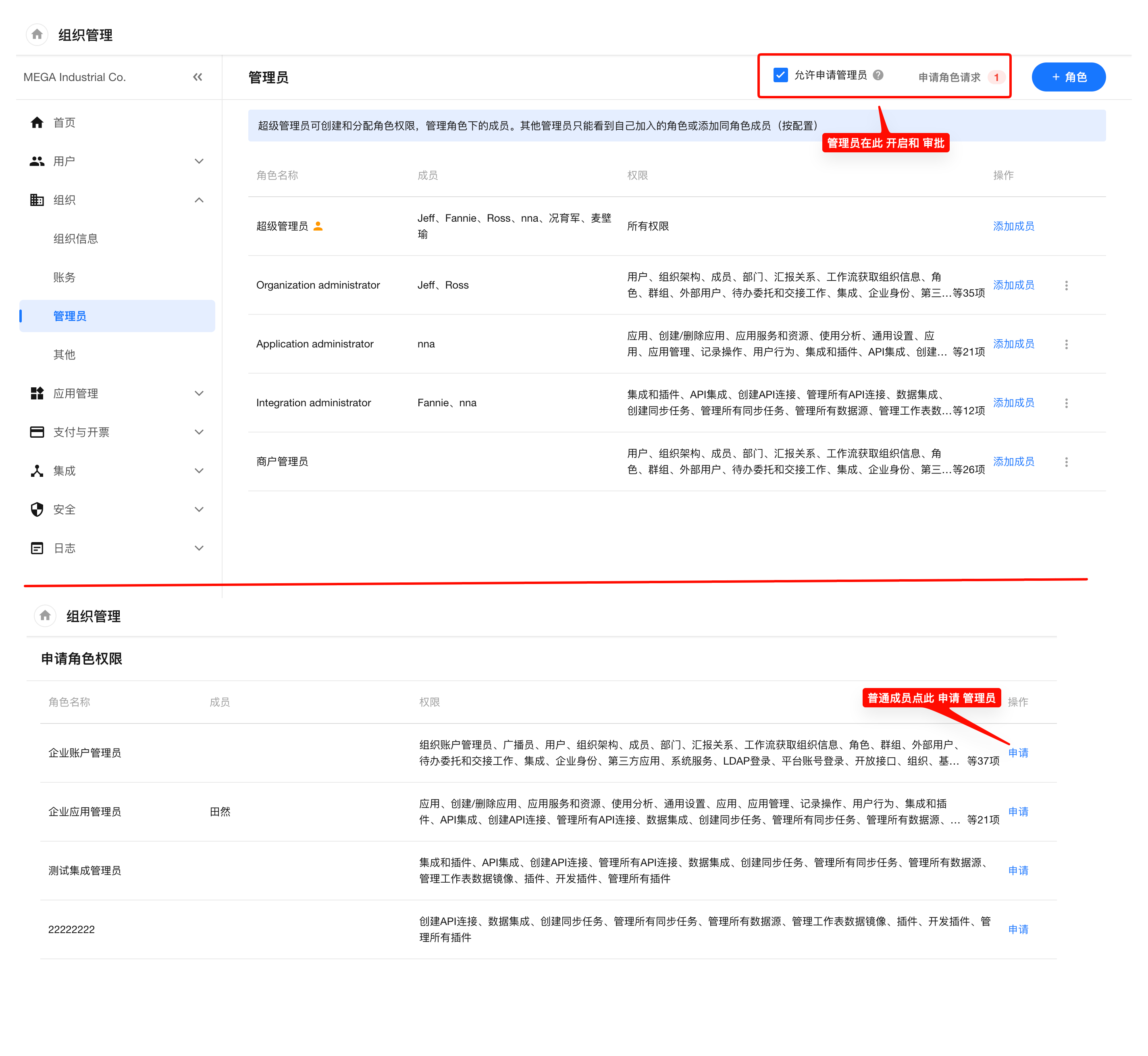 开启申请入口: 在设置中勾选“允许申请管理员”后,普通成员可在后台看到自定义角色列表并提交申请。