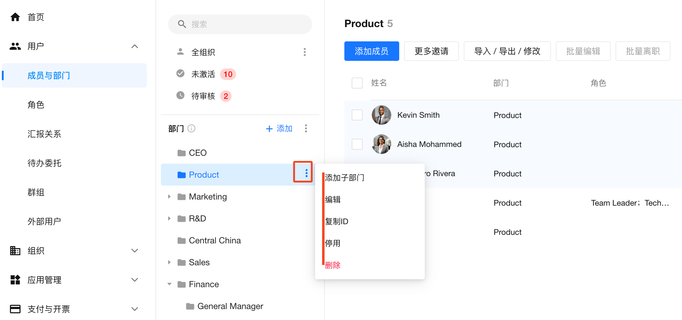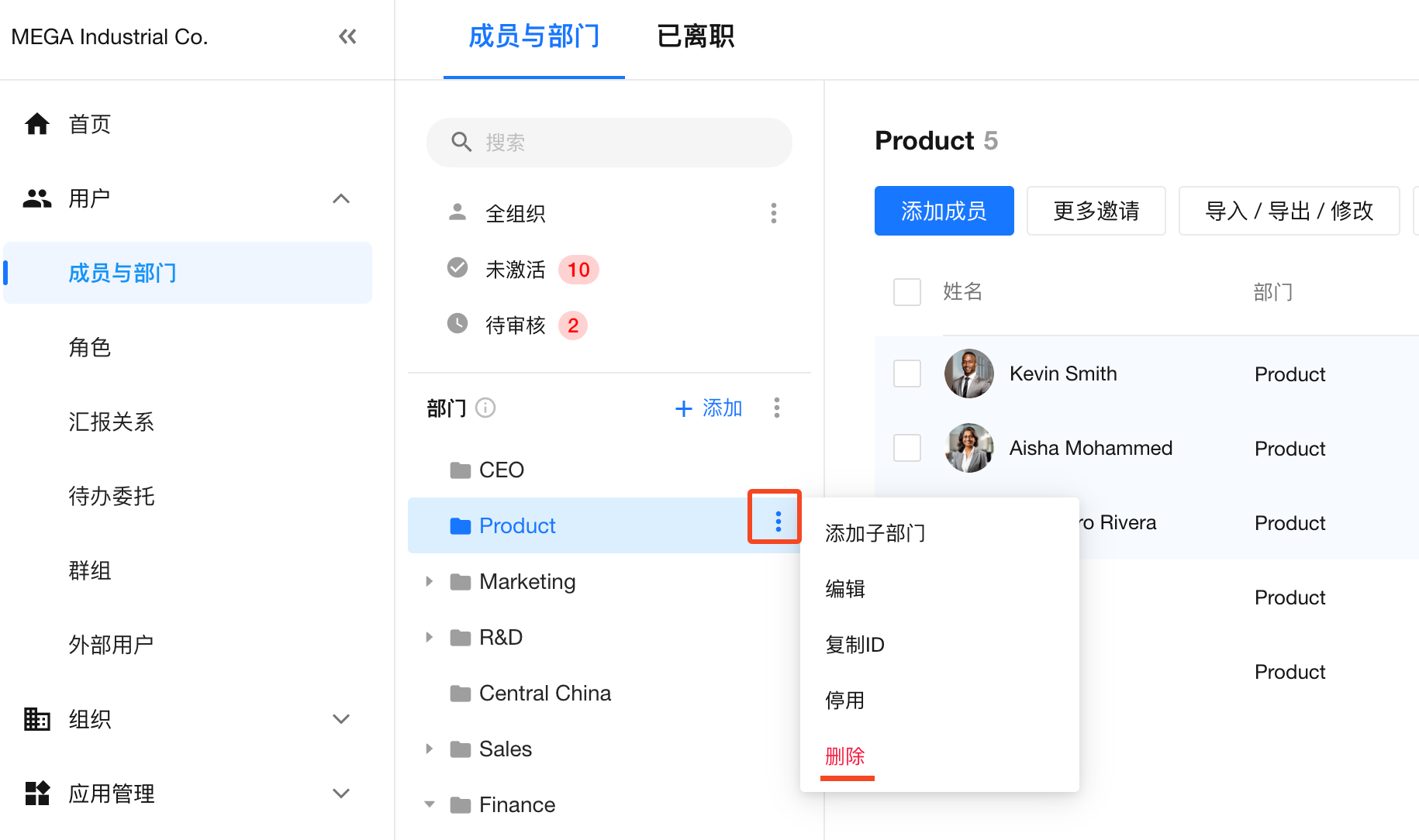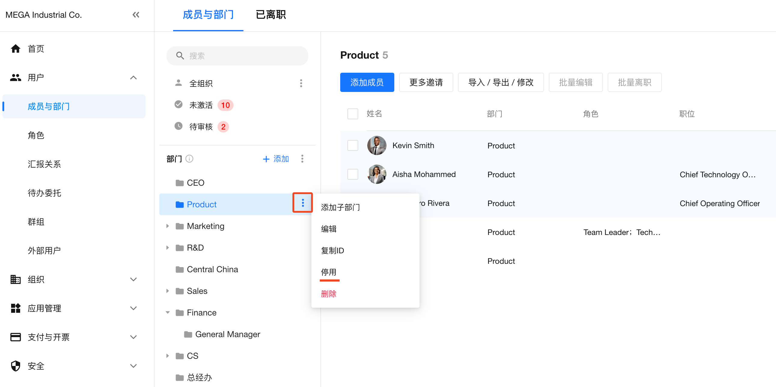 在部门列表中,点击部门名称右侧的操作按钮,可将该部门设置为停用。