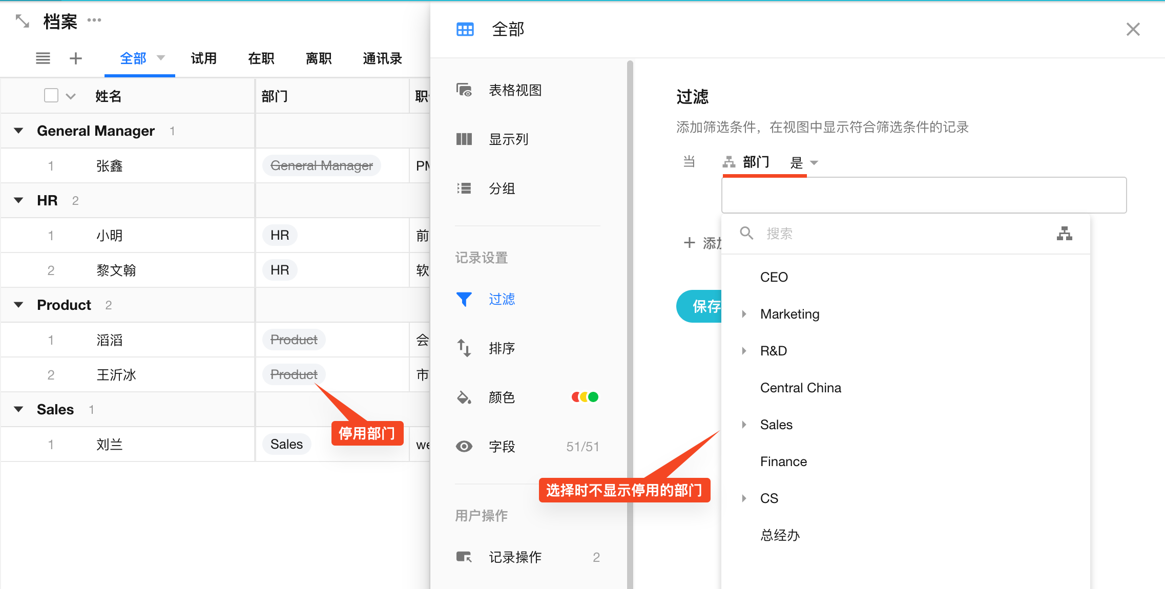 停用部门在选择列表中隐藏(通讯录、部门字段)