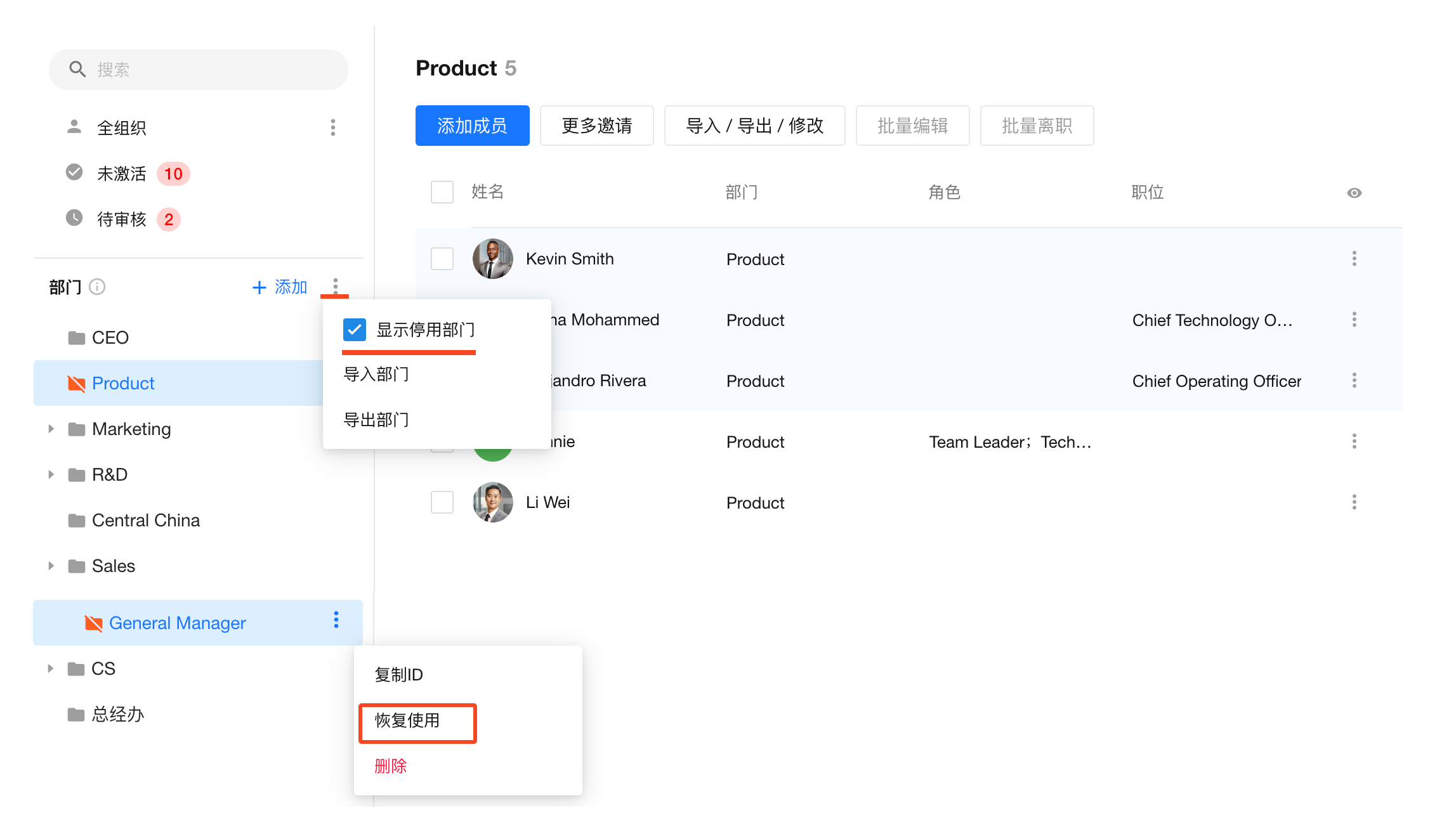 管理员仍可在组织管理的部门列表中查看并管理停用部门与其成员。