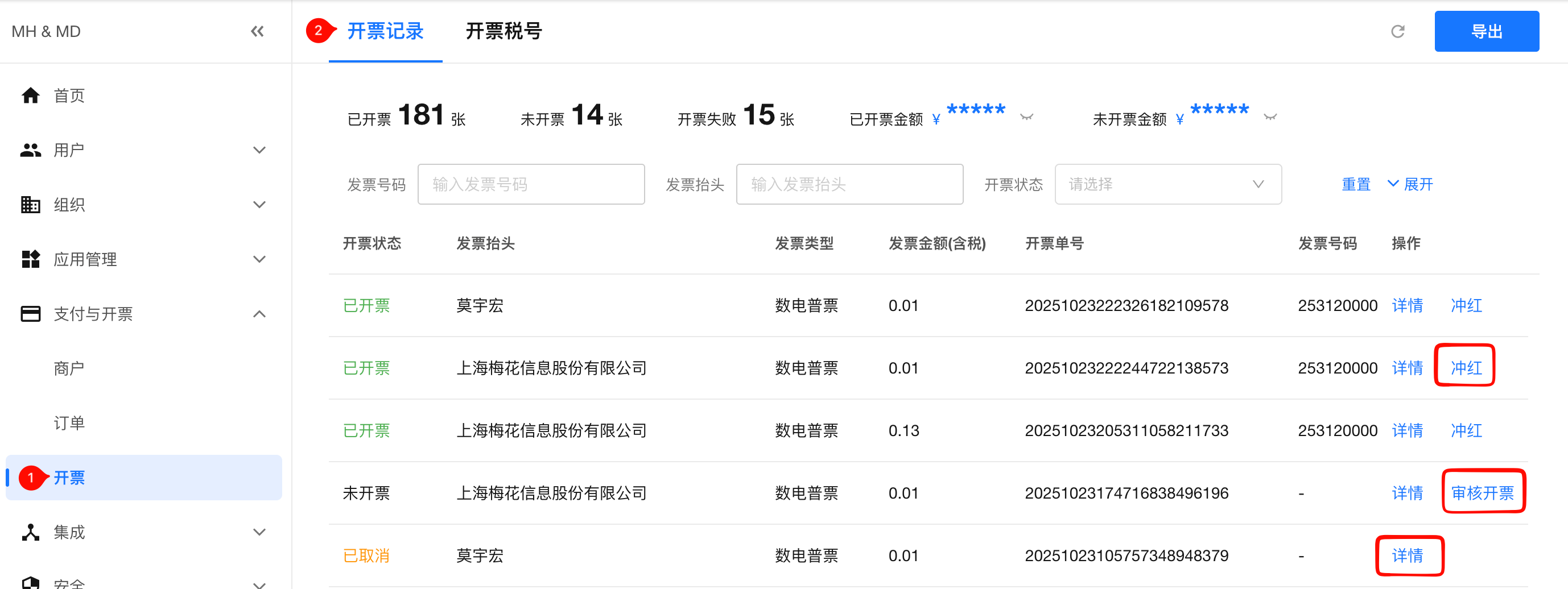 开票记录有【审核开票】、【冲红】、查看【详情】等操作。