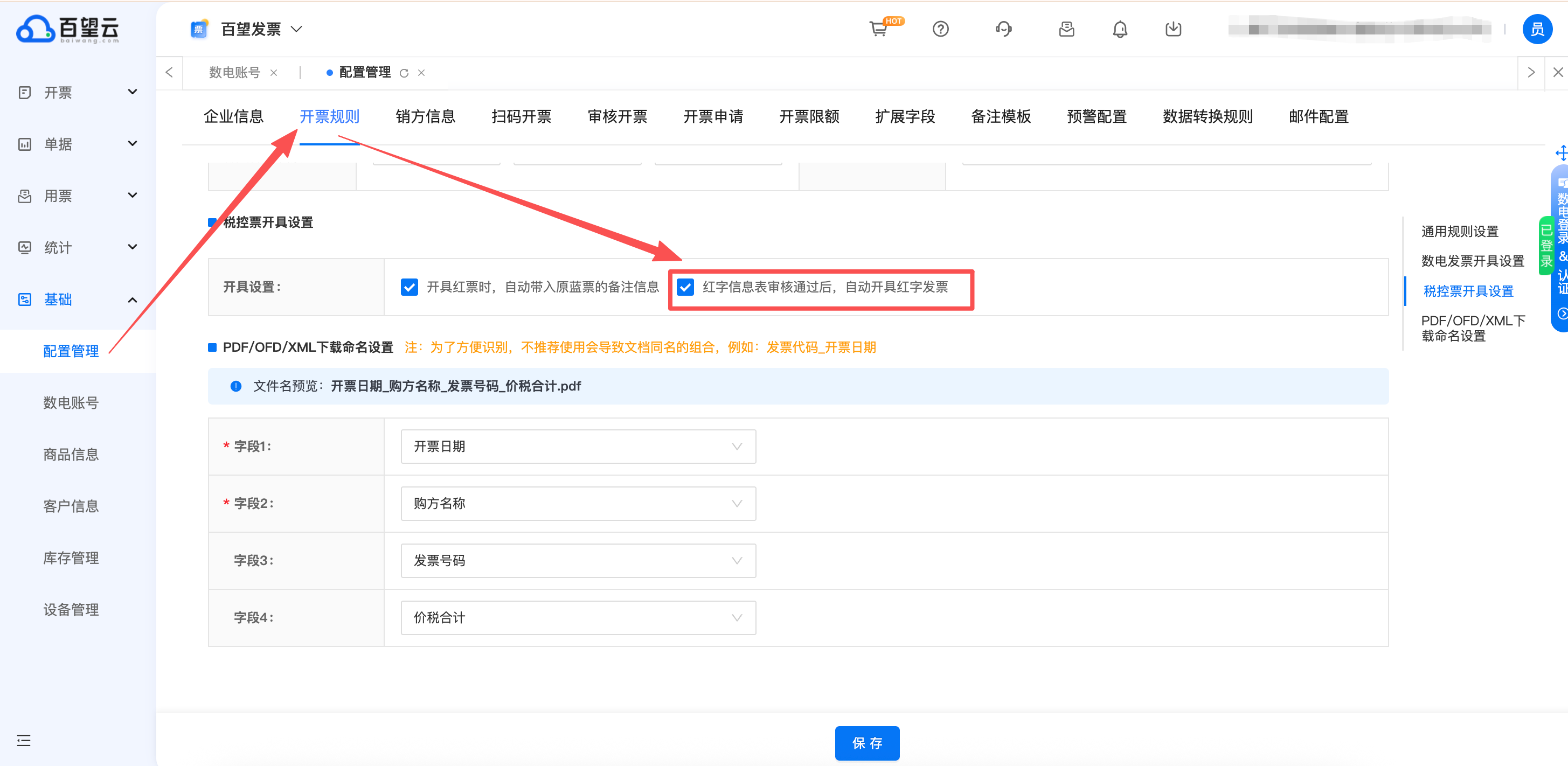 在百望云平台中依次点选 "基础" > "配置管理" > "开票规则",设置基础开票规则。