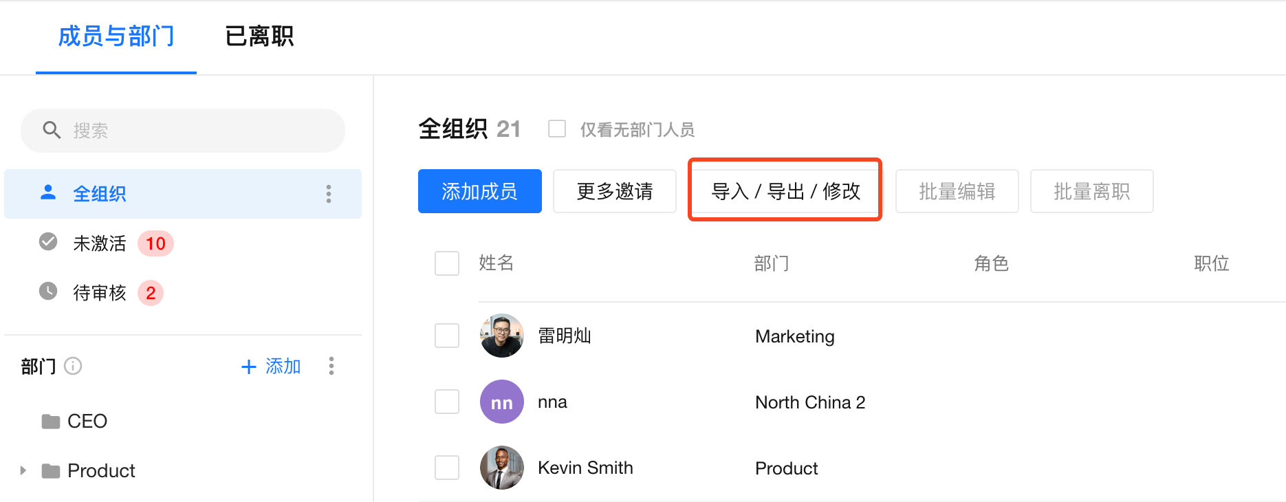 如果您是组织管理员,可以点击系统右上角头像依次进入"组织管理" > "成员与部门"中,执行批量导入。
