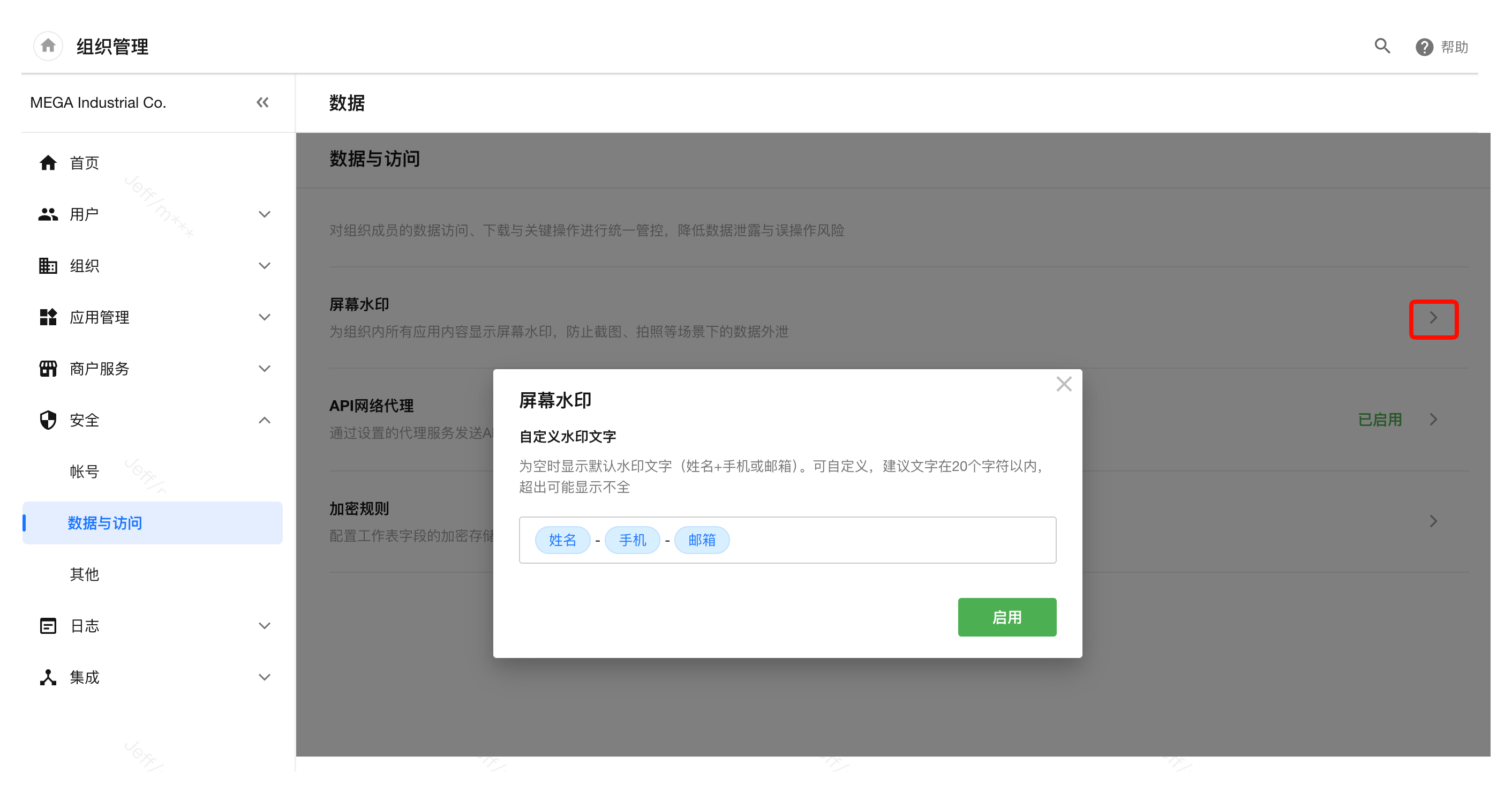 管理员依次点击 "系统右上角头像" > "组织管理" > "安全" > "数据与访问" ,页面中即可开启或关闭水印功能。