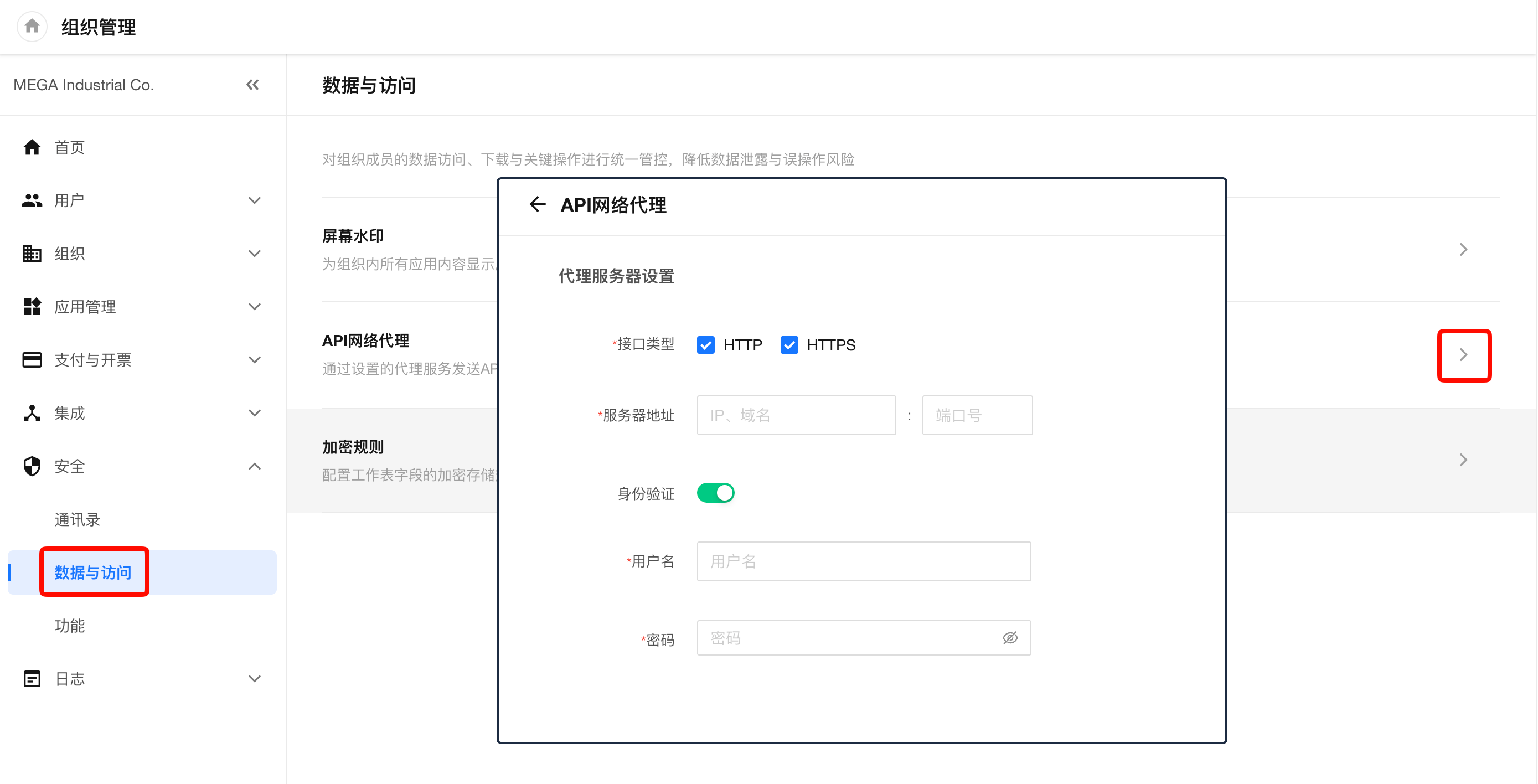 管理员进入 “组织管理后台 > 安全 > 数据与访问”,在功能列表中启用 [API网络代理]。开启后,点击右侧的 “设置” 填写代理服务器信息。