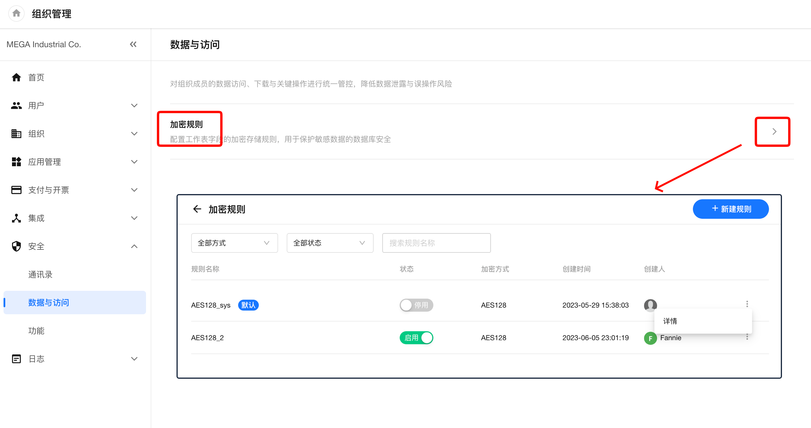 在组织管理,依次进入"安全" > "数据与访问" ,在页面功能列表中点击"加密规则",进入管理页面,可以新建和管理加密规则。