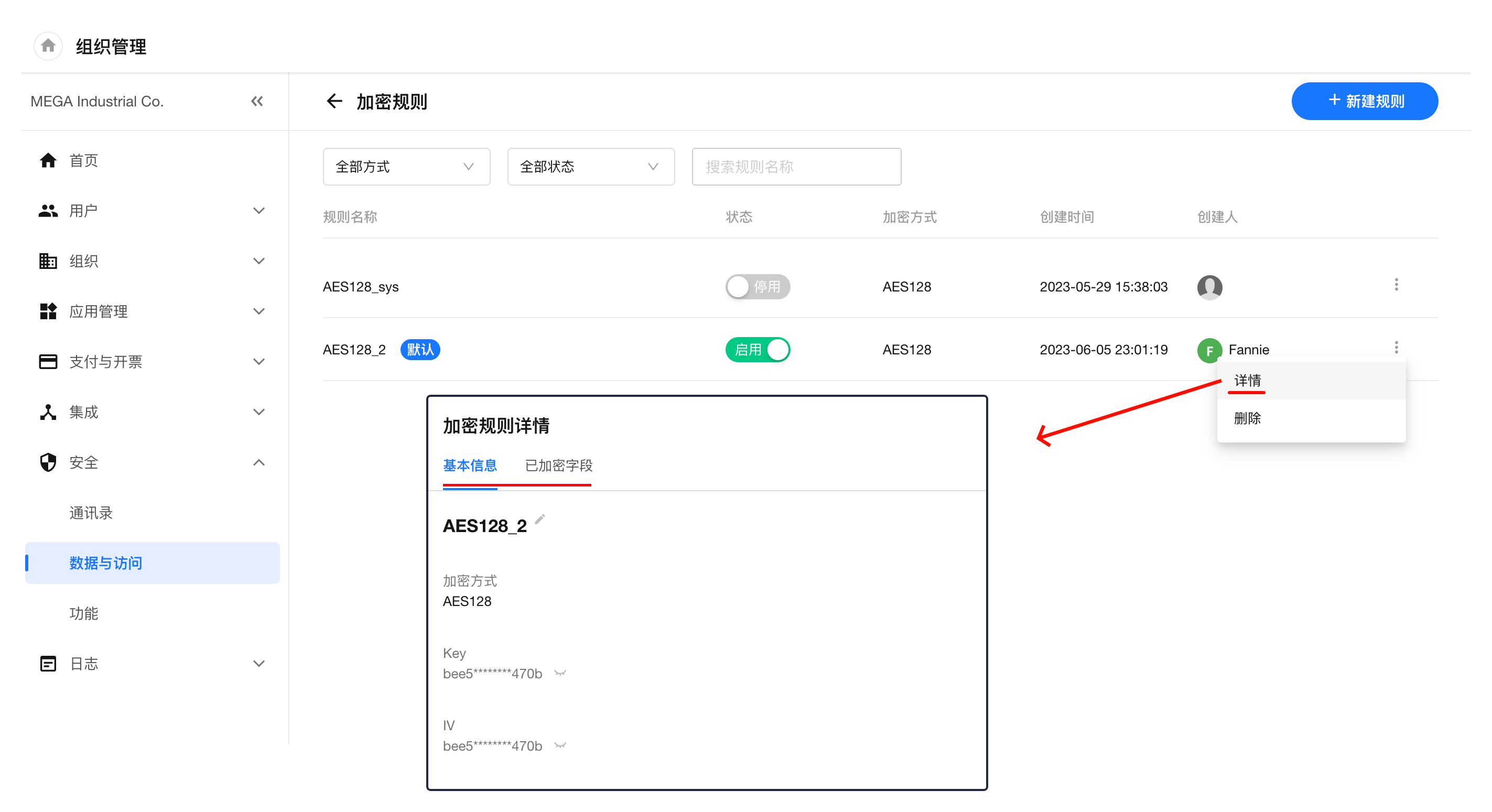 每个组织自动创建一个默认加密规则(加密方式AES,密钥随机生成),组织下的超级管理员可以继续创建加密规则(设置加密方式、密钥)。