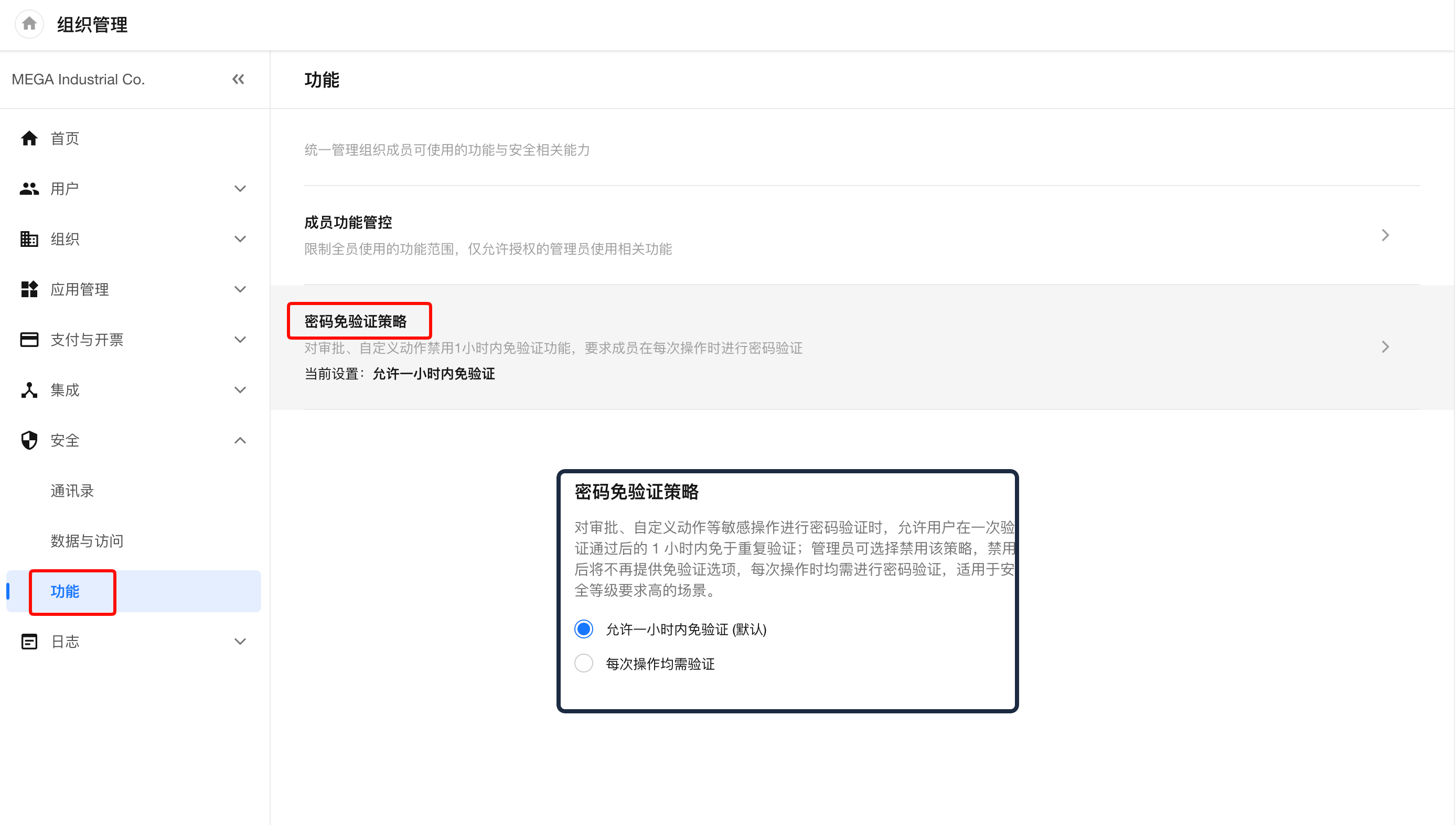 在组织管理后台,依次进入"安全" > "功能" > "密码免验证策略",可启用"操作免验证"功能。