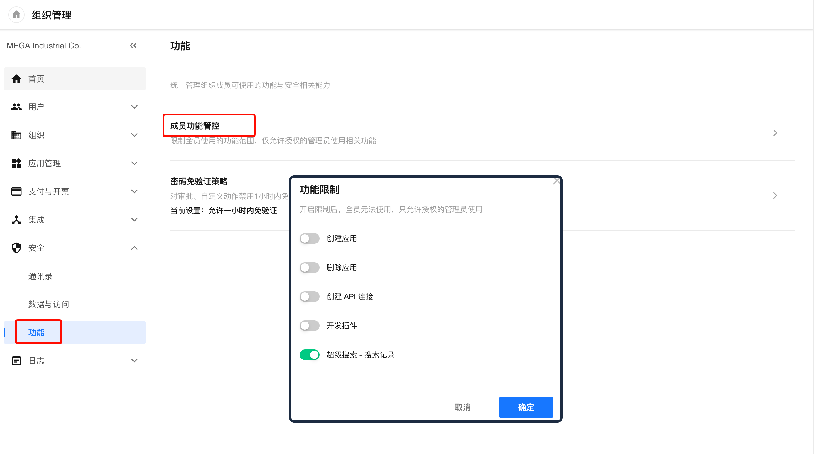 在组织管理后台,依次进入"安全" > "功能" > "成员功能管控" ,在弹窗中可开启相应模块的功能限制。