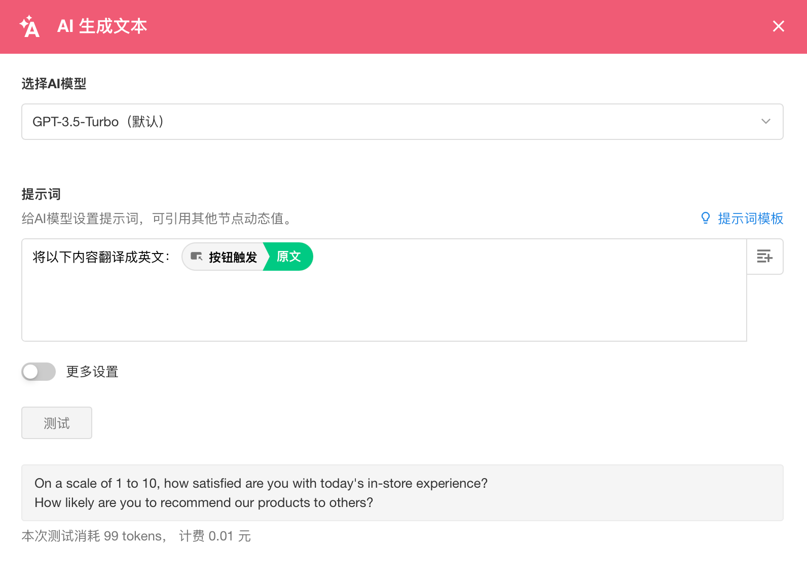点击测试按钮,输入一段测试文本进行验证,下方会显示结果文本和费用。