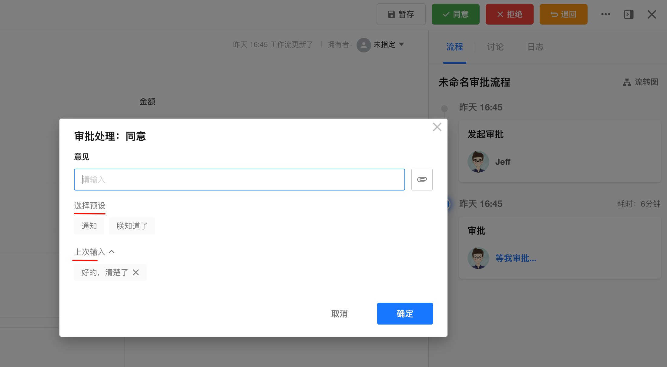 审批时,不同企业对于同意/否决的叫法是不一样的,例如有的把通过叫“同意”。审批的通过和不通过按钮默认是【通过】和【否决】,如下图: