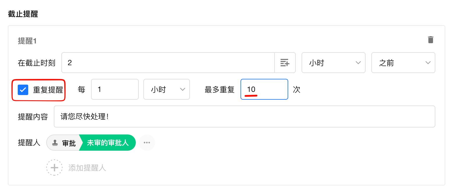 如下图:在截止时间前2个小时,提醒审批人(提醒人可以设置多人)。
