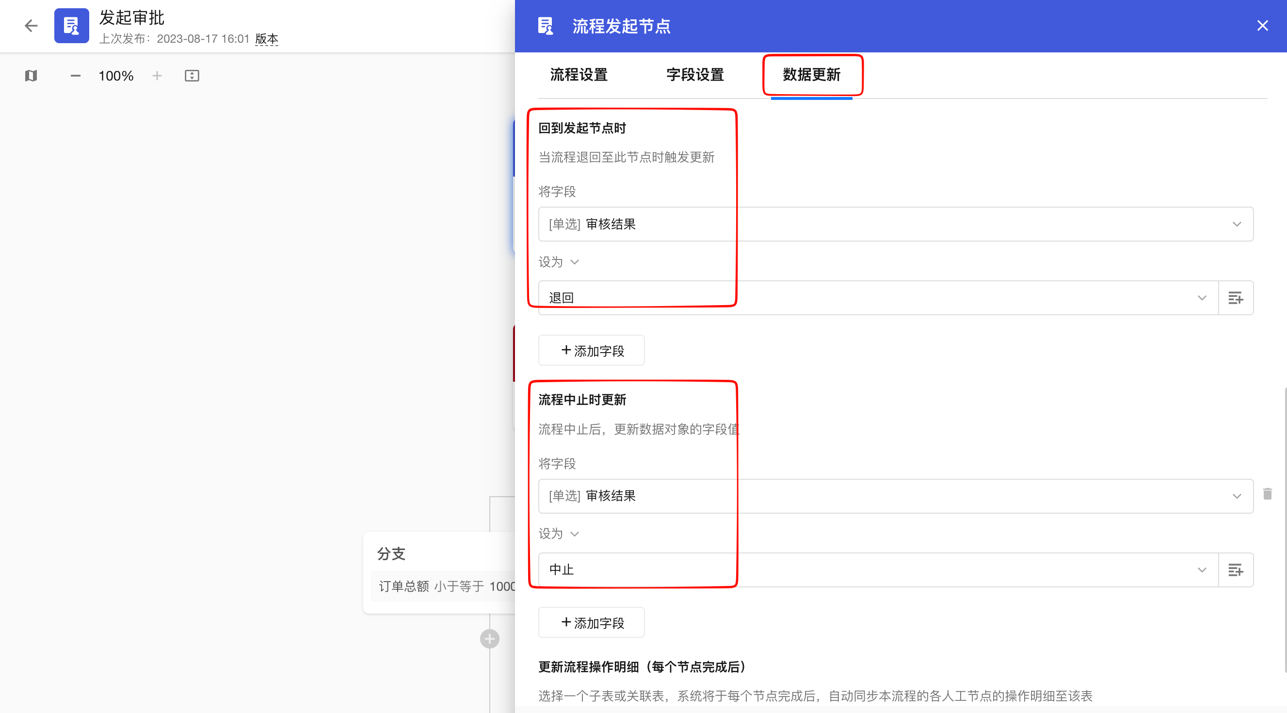 在【发起审批节点】的【数据更新】配置中,可以设置当流程退回到发起人或流程中止时,系统自动修改指定字段的内容(例如:将单据状态同步为“已退回”)。