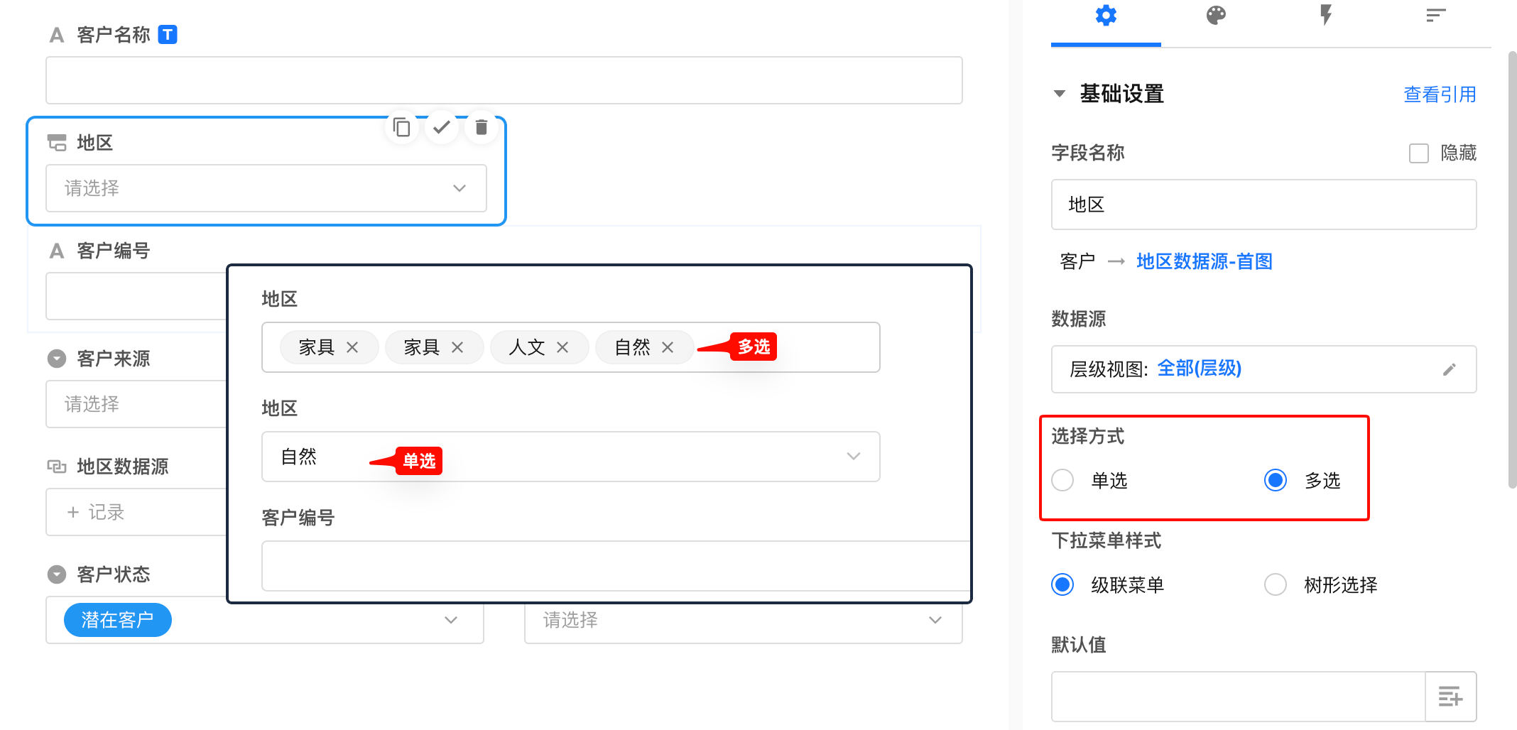 其他字段值: 其他级联选择字段,且使用了相同的数据源时,可以直接引用其值。