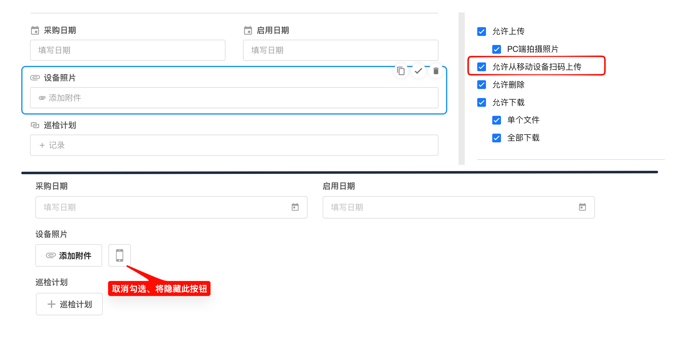 开启 “允许从移动设备扫码上传” 后,附件字段支持跨设备协同操作。