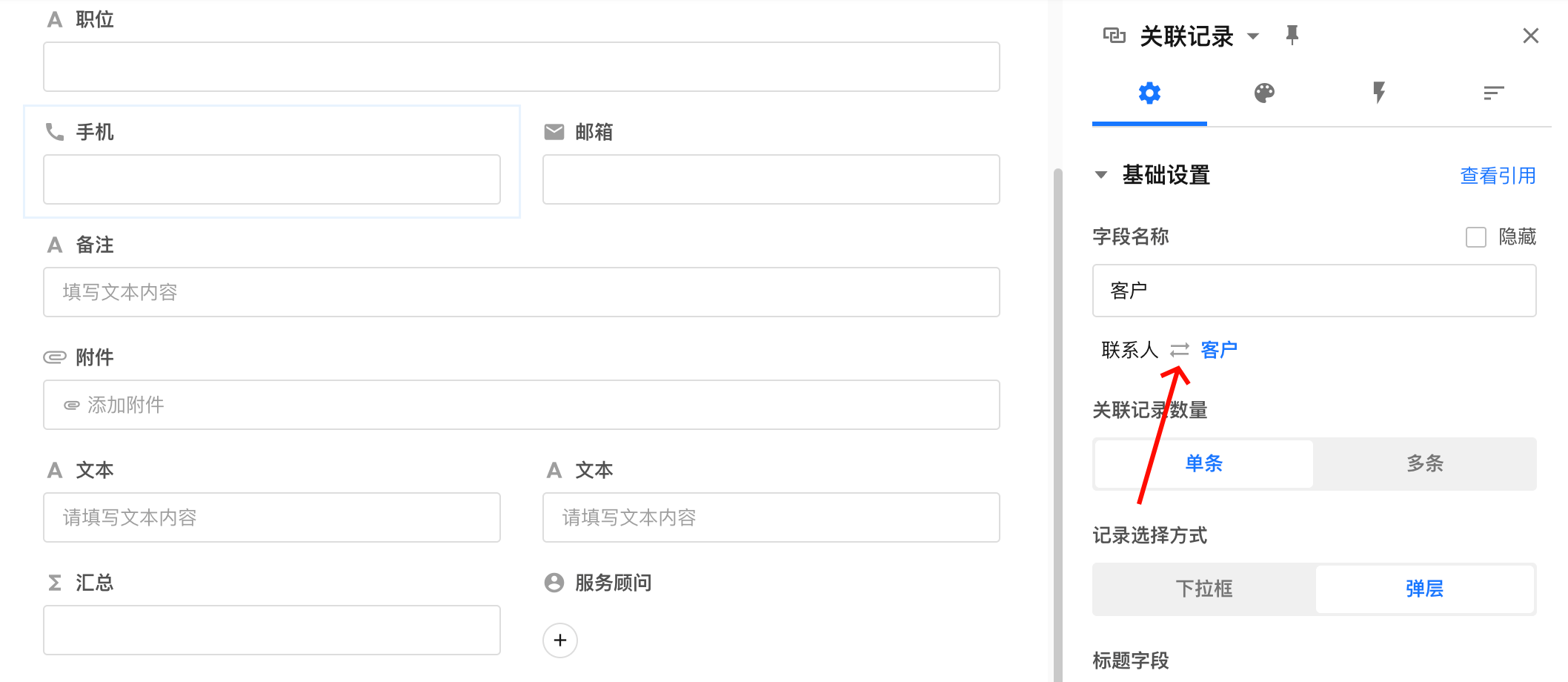 单条: 最多只关联 1 条(例:一个联系人只能所属一个客户公司)。