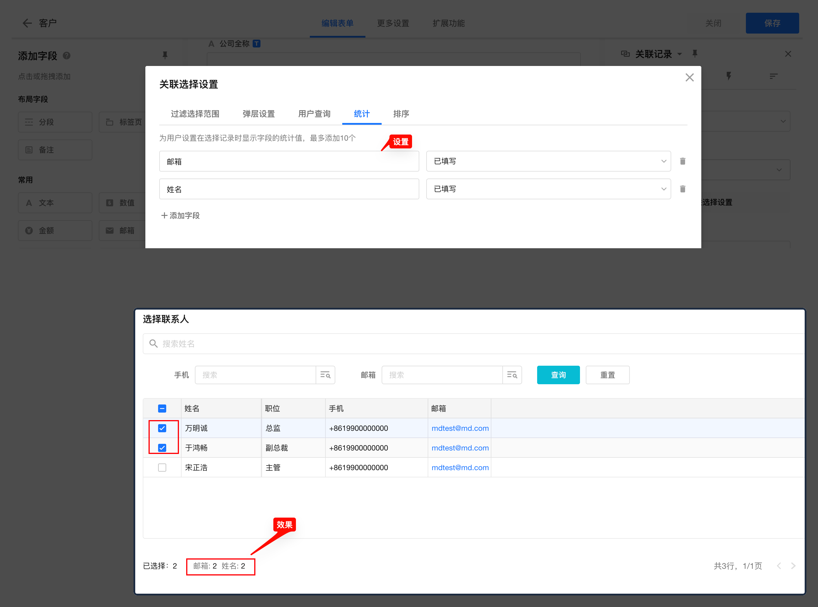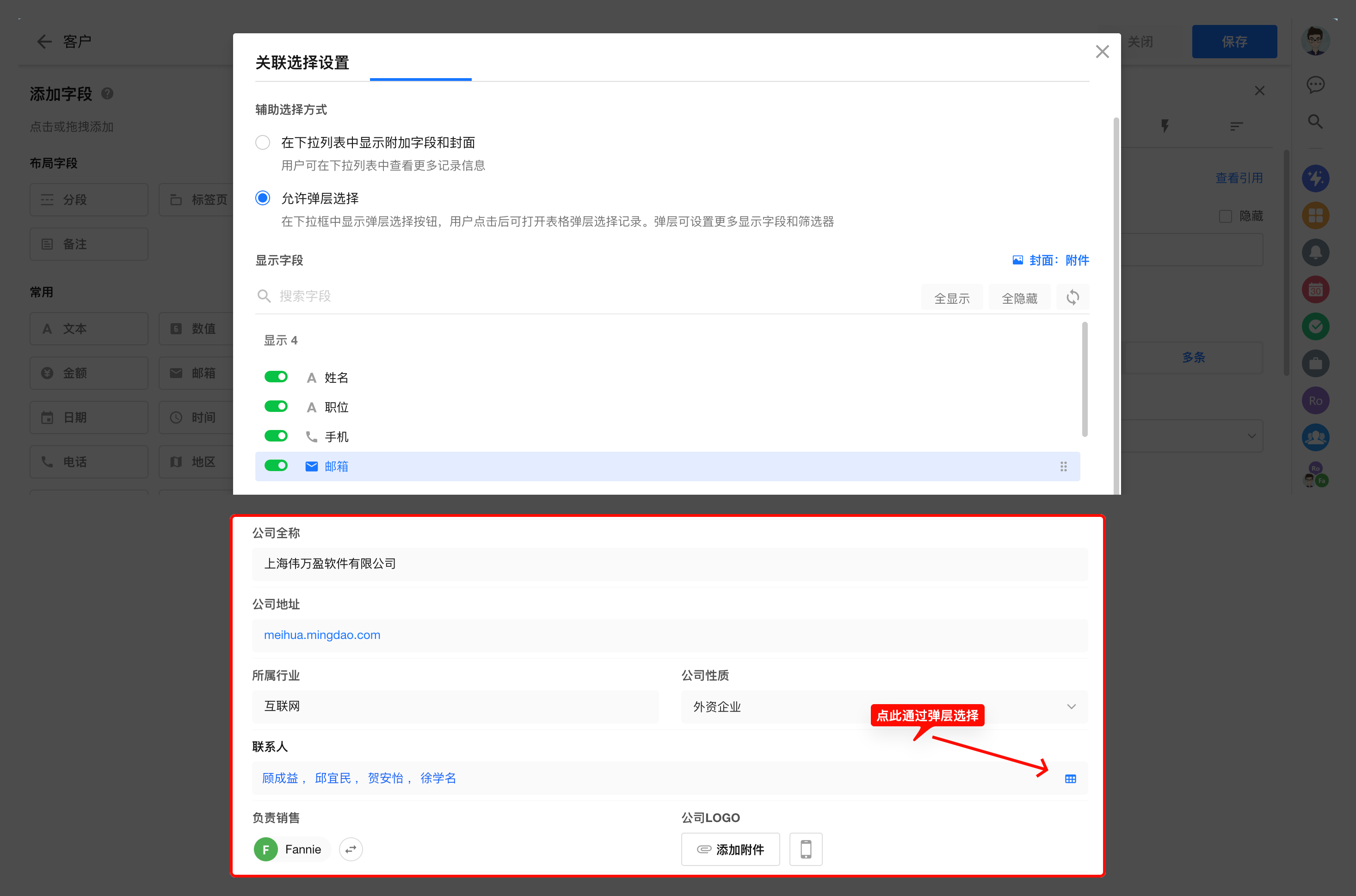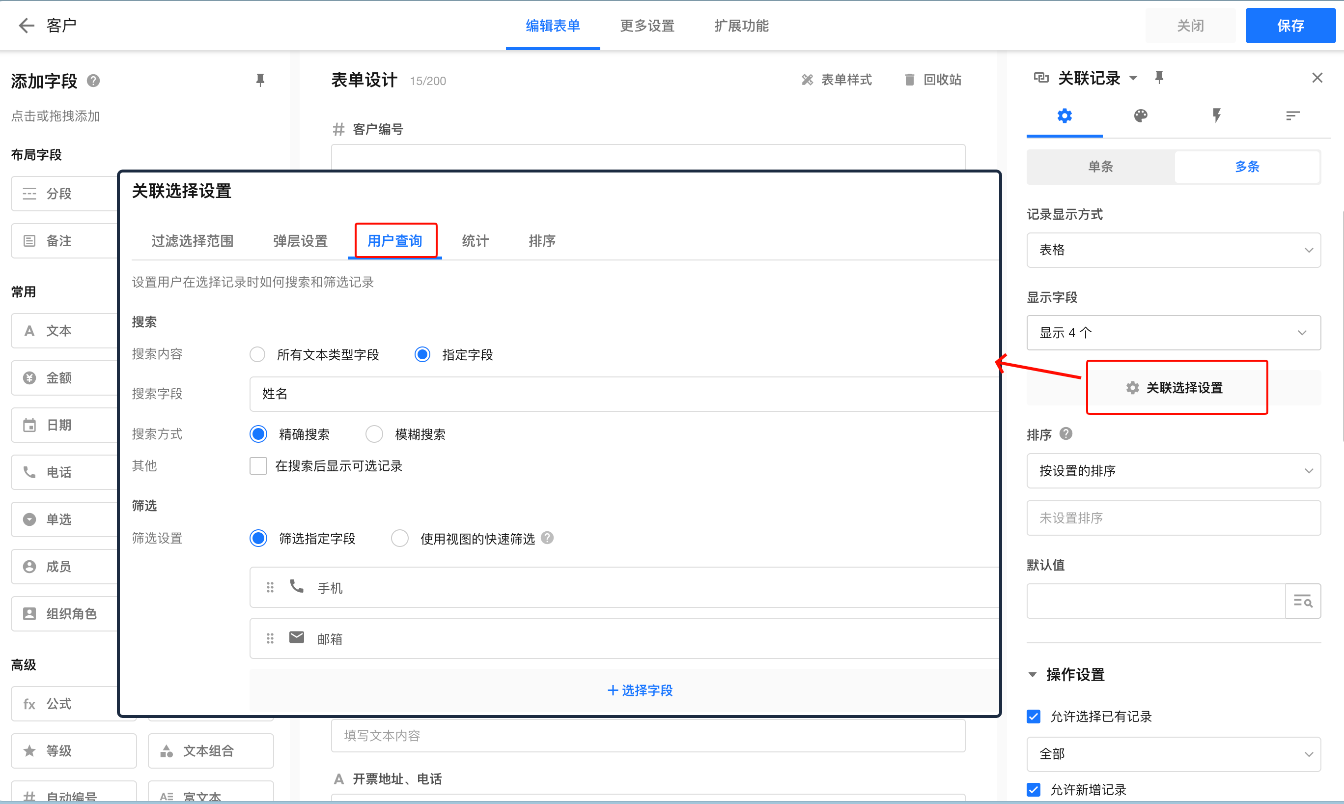 在“关联选择设置”中配置用户在关联时待选记录的界面。如筛选范围、弹层设置(下拉框设置)、查询方式、显示字段、统计与排序。