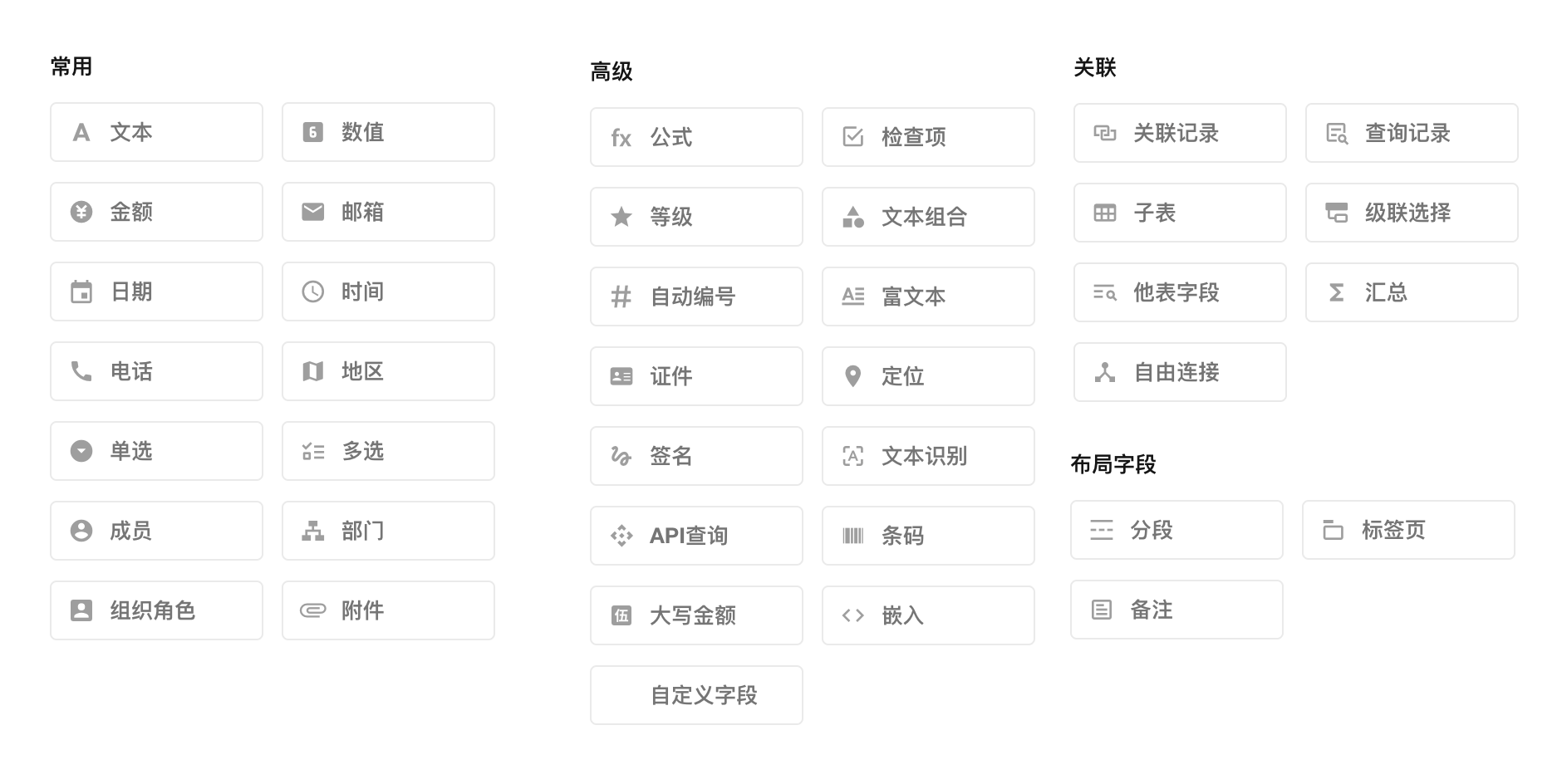 字段和控件: 为了字段数据的规范和正确的输入,预先设置了一些格式化的字段类型,即控件。例如,日期控件、邮箱控件、金额控件等等。 添加字段时,需要先根据此字段的数据类型选择合适的控件。