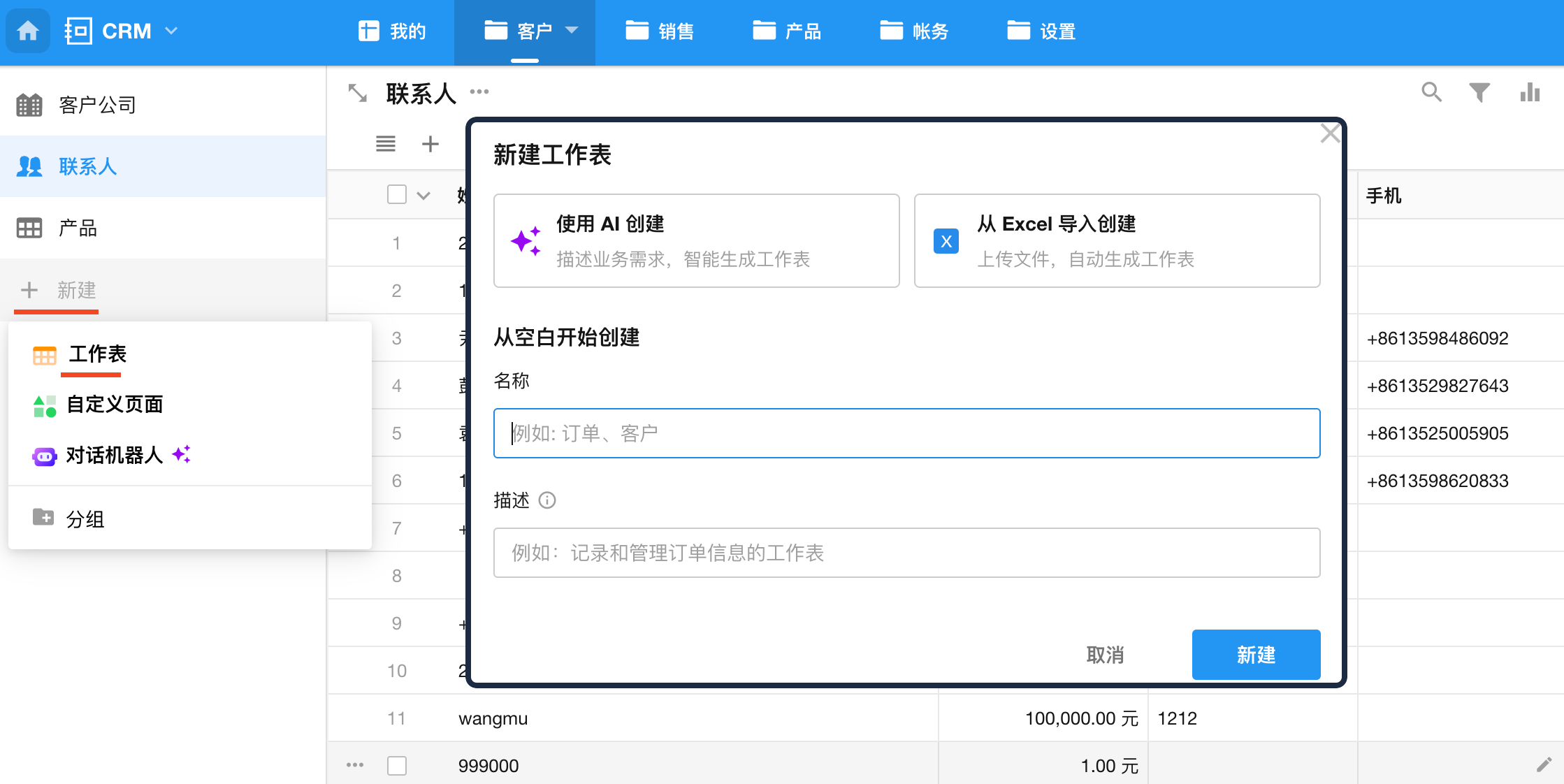 有三种方式创建工作表:从空白创建、AI创建、Excel导入创建。