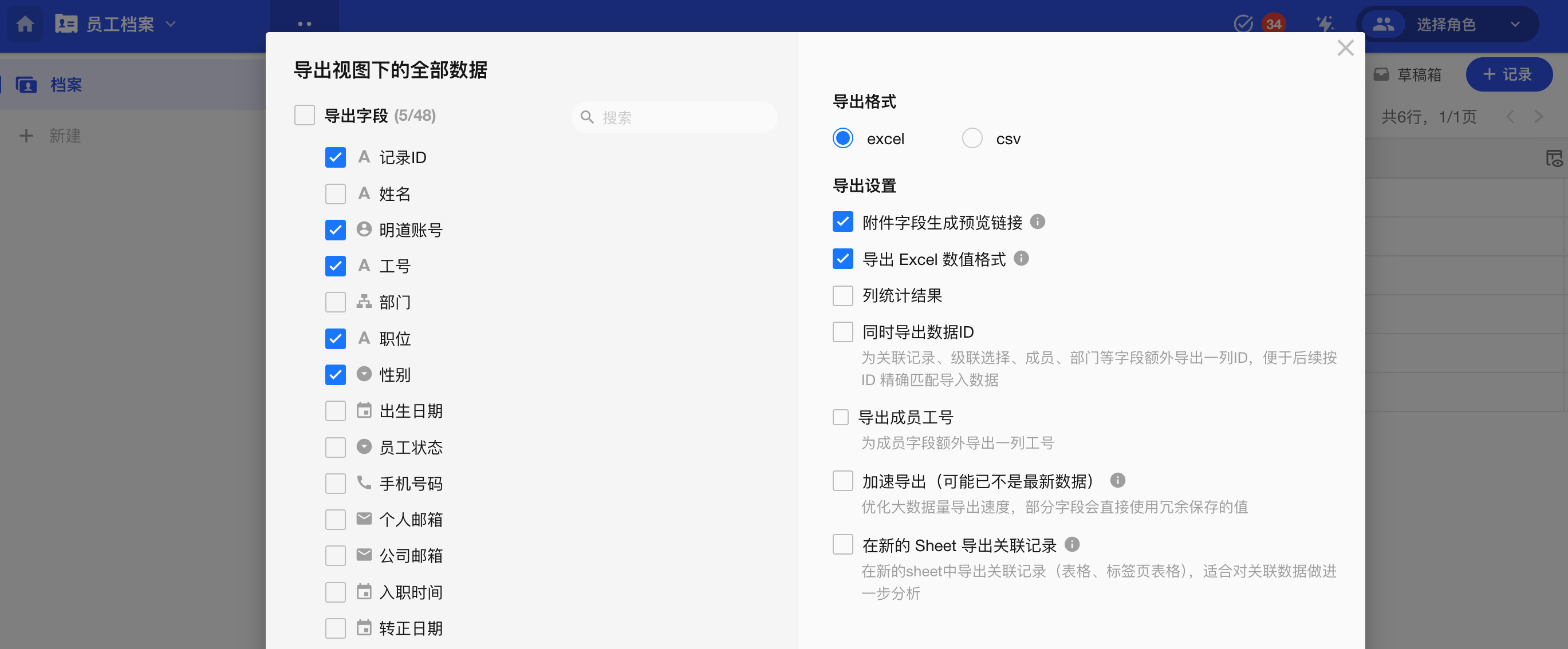 导出时可以选择导出哪些字段,以及其他配置,如关联记录的导出方式、导出文件格式(Excel、CSV)等。