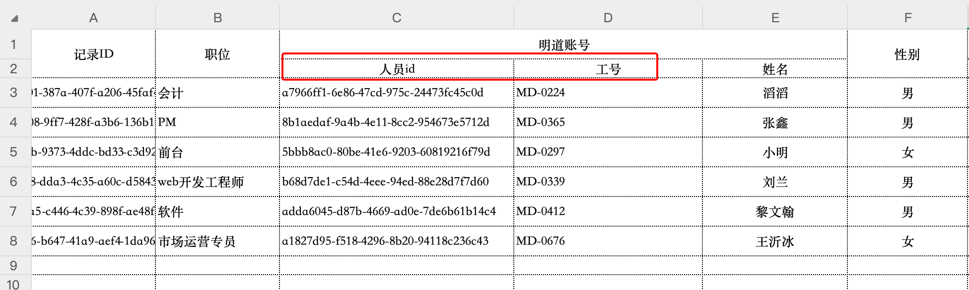 在导出关联记录(单条)、级联选择、成员、部门等字段时,除了导出文本外,会额外导出一列ID,便于后续按 ID 精确匹配导入数据。 当有重名时内容时建议导出数据ID。
