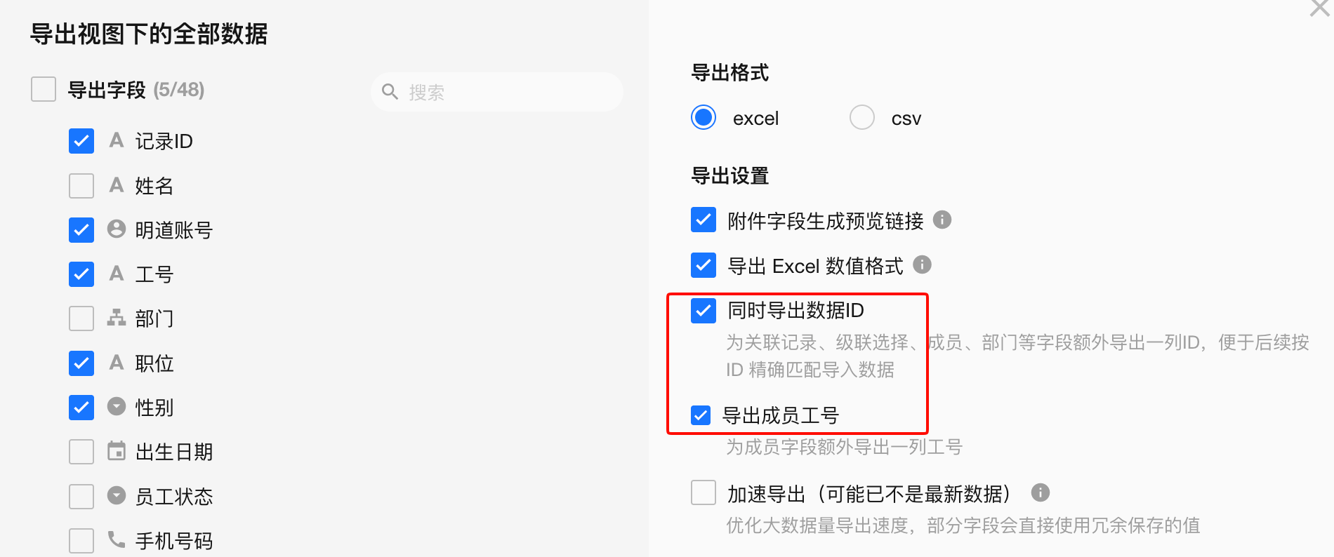 如果勾选了“加速导出”,会导出冗余字段数据,此时导出速度会很快,但导出的数据可能是旧的,不过多数情况下数据都会即时同步为最新的数据的。如果关联的记录数据不会改变,再导出时建议选择加速导出。