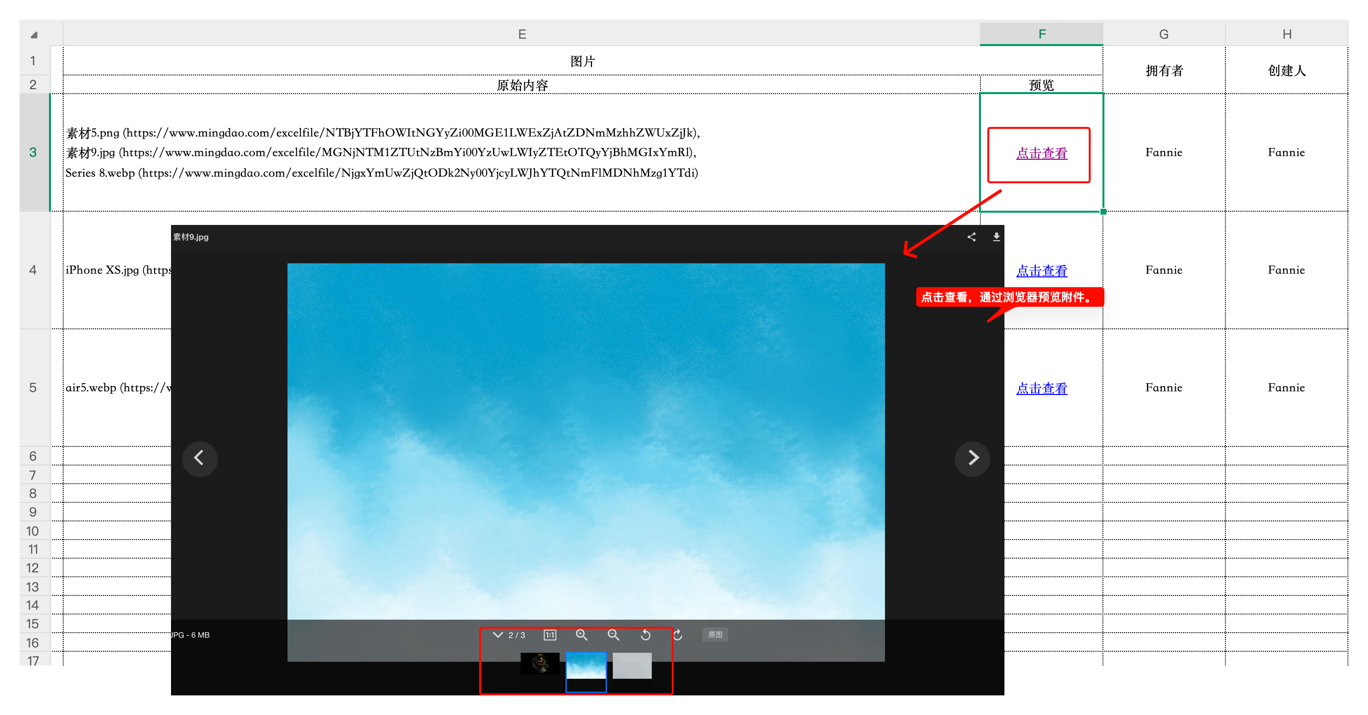 勾选“附件字段生成预览链接”,附件导出Excel时增加预览附件的链接。点击链接可以直接预览此行记录的多个附件。