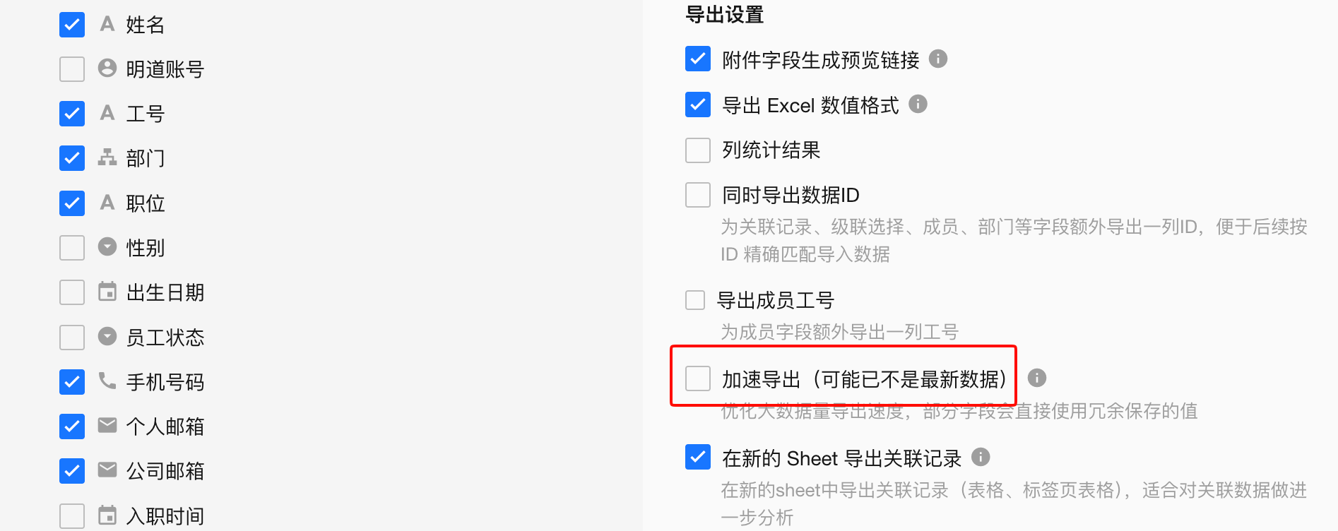 在导出数据时,如果不勾选加速导出,会即时获取到其关联记录的最新数据,因此速度可能会慢。