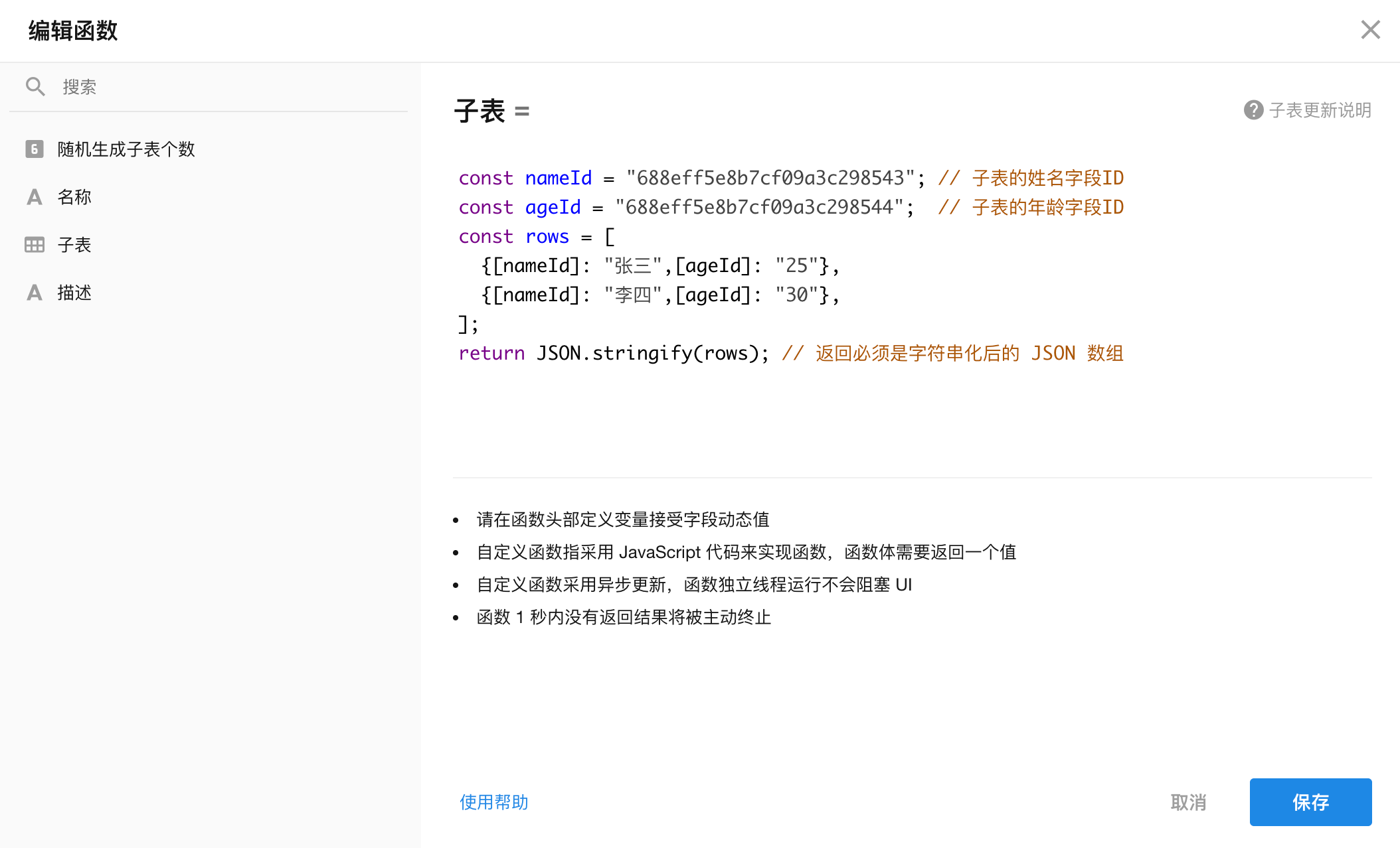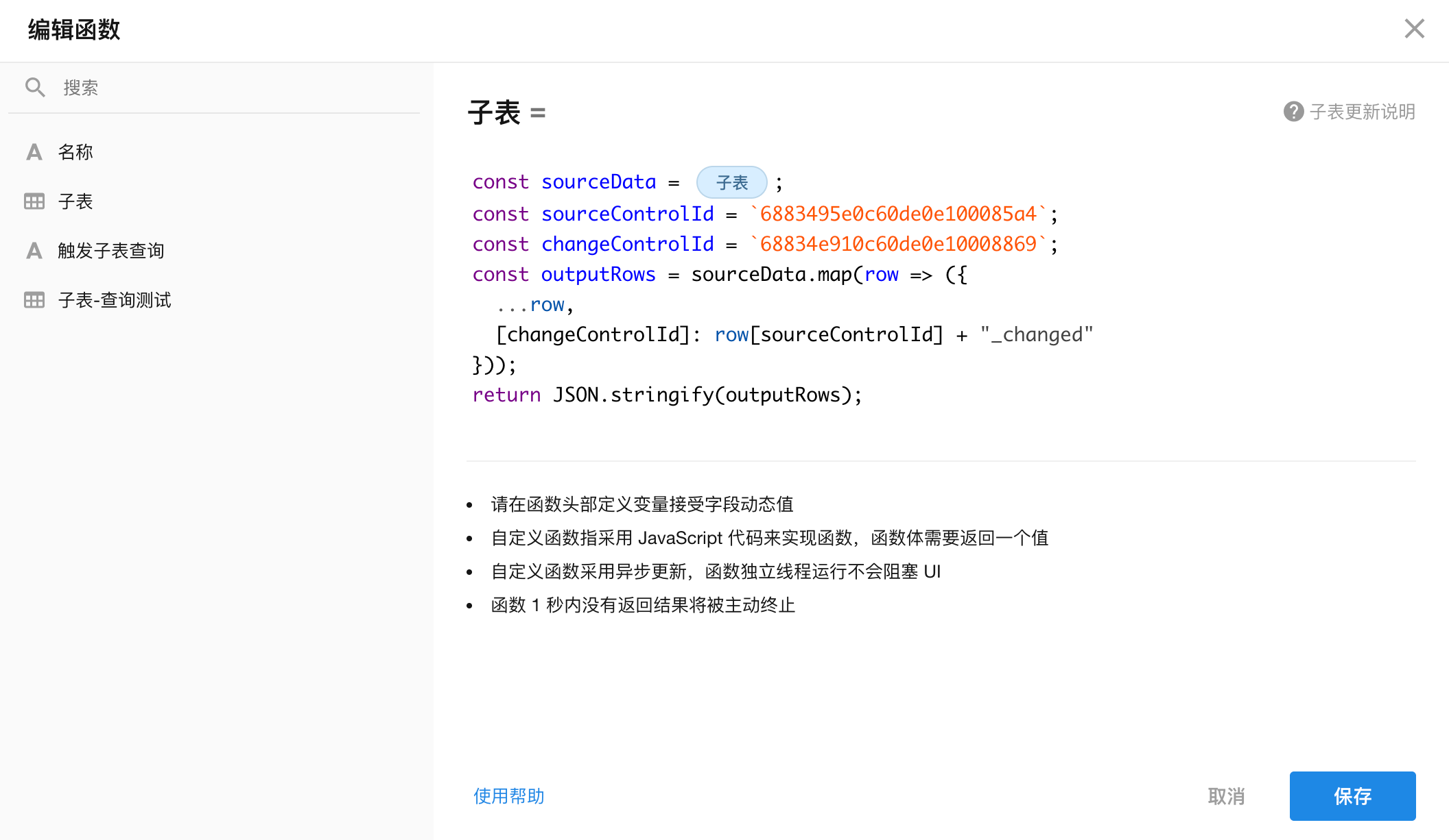 1.函数返回值需要保证和当前子表的数据结构完全一致,从而对子表数据进行全量替换更新。否则将会导致未知异常问题。