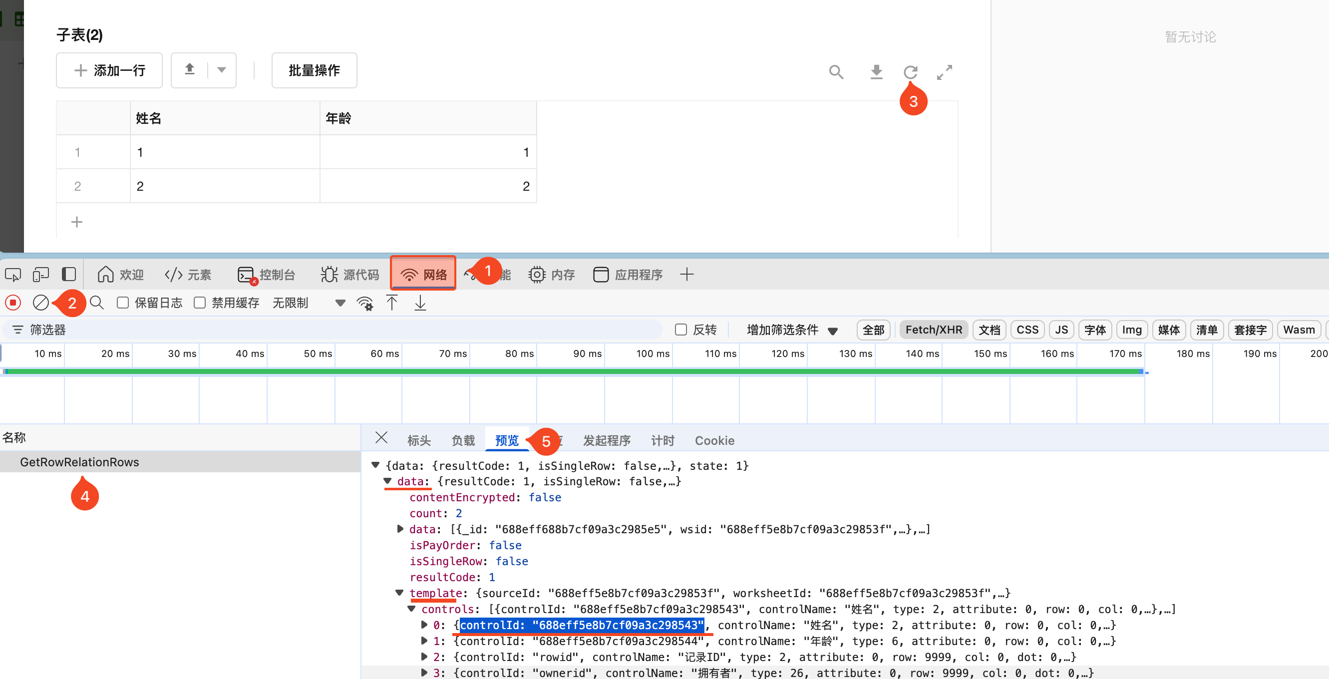 打开一条记录详情,按F12 ,刷新子表数据,查看"GetRowRelationRows"接口的返回数据,即可找到子表中每个字段的字段ID(controlId)
