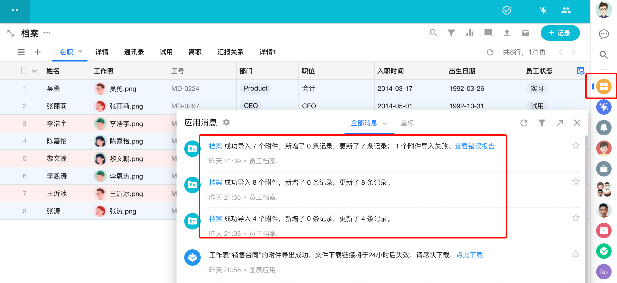 • 应用日志:在“记录操作”类目下,操作类型为“导入”,对象为“工作表记录”。