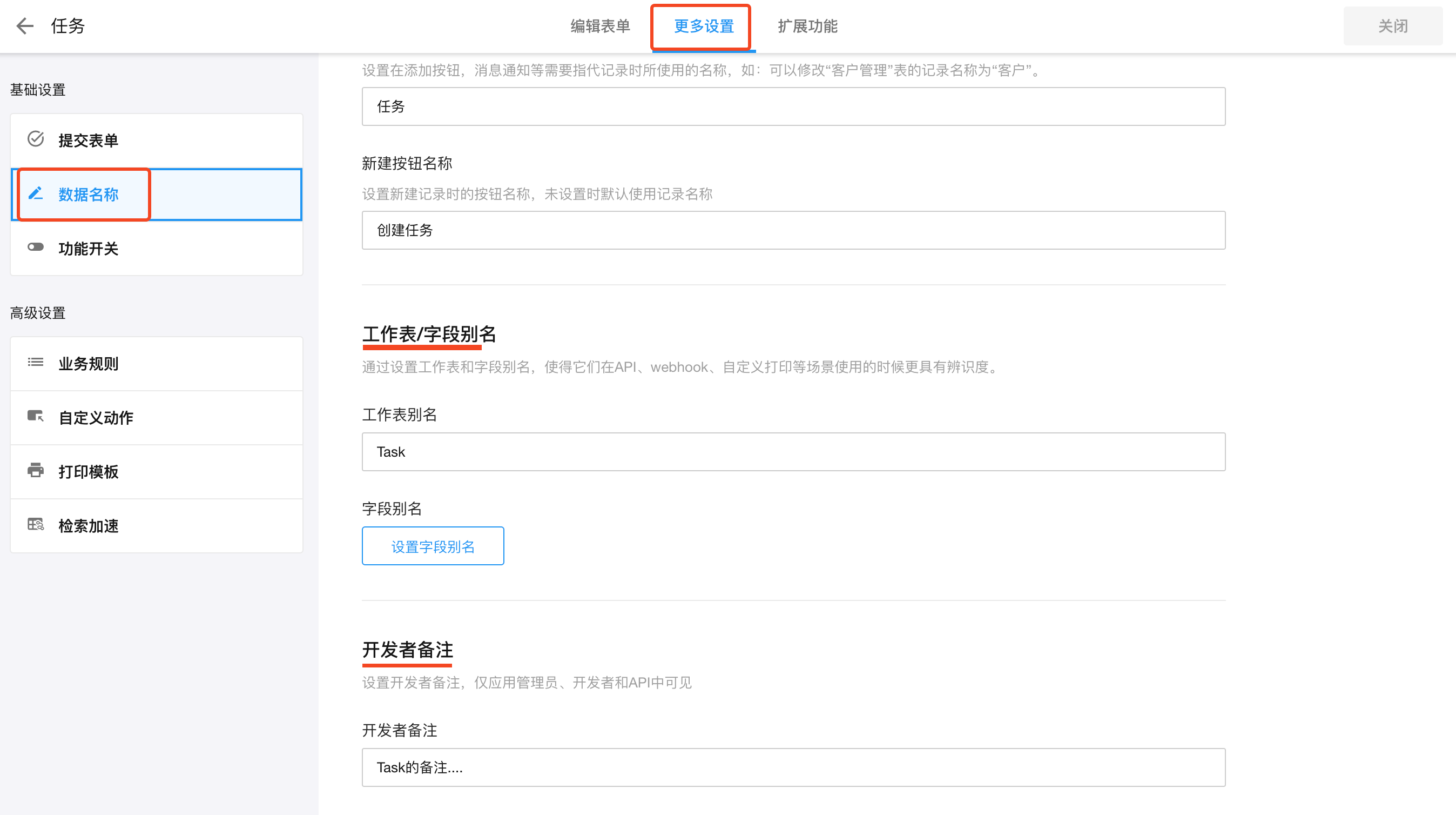 在表单设置中的“数据名称”中,可设置工作表别名、字段别名和开发者备注。