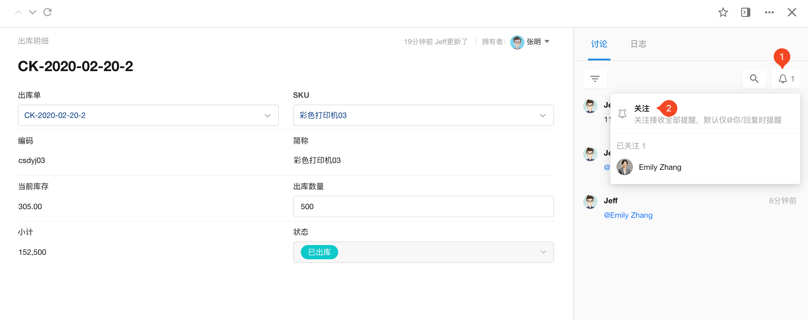 工作表中有权限查看记录的成员可关注讨论,通过@才能查看记录的用户,不支持关注讨论。