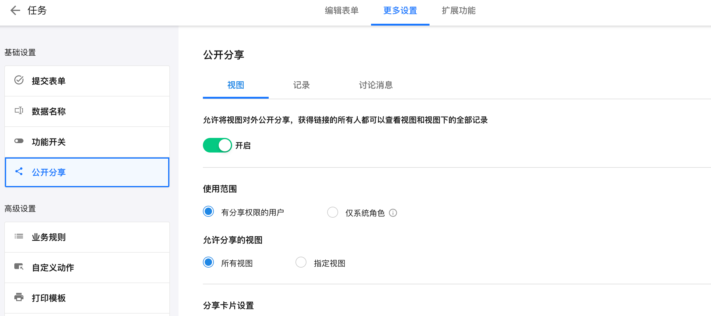 在“编辑表单” - “更多设置” - "公开分享" 页面的"视图"页签中,可以开启或关闭视图的分享功能。