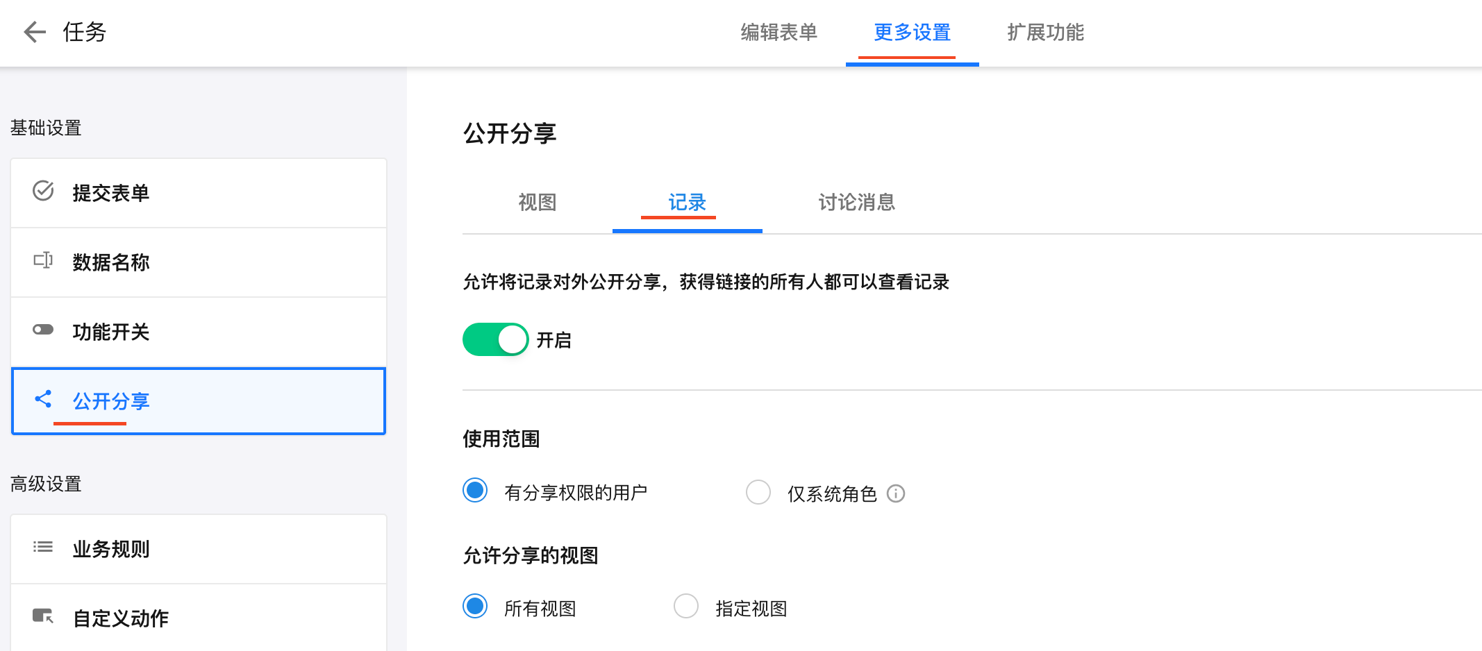 在“编辑表单” - “更多设置” - "公开分享" 页面的"记录"页签中,可以开启或关闭记录的分享功能。